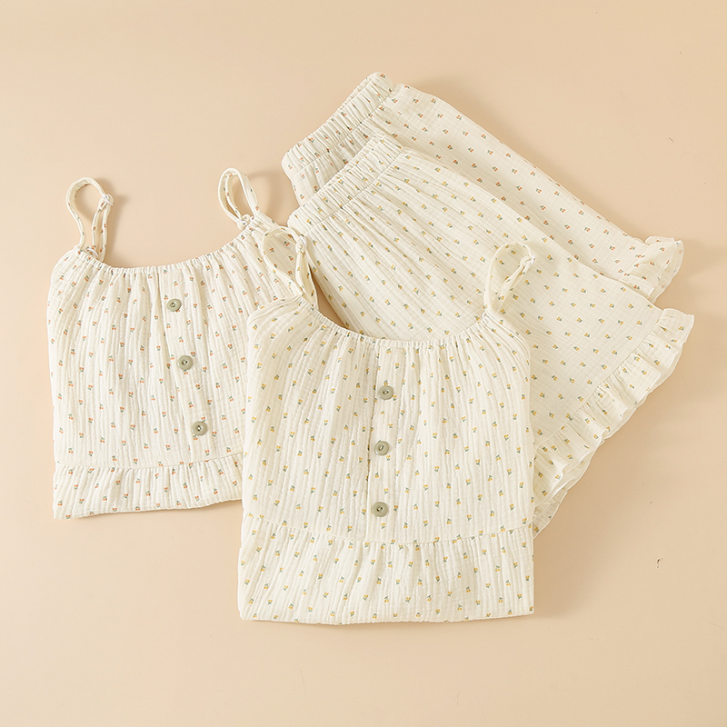 夏季睡衣女纯棉双层纱布纯欲风碎花吊带短裤薄款柔软家居服套装