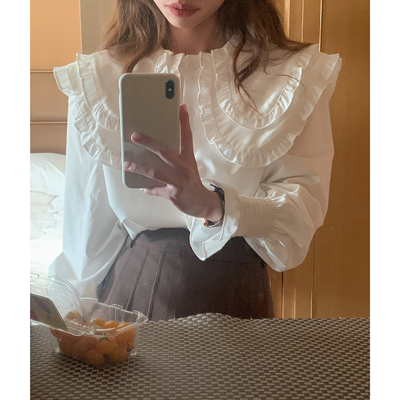 范雯雯 法风娃娃领 早春法式复古甜美上衣少女纯色宽松长袖衬衫
