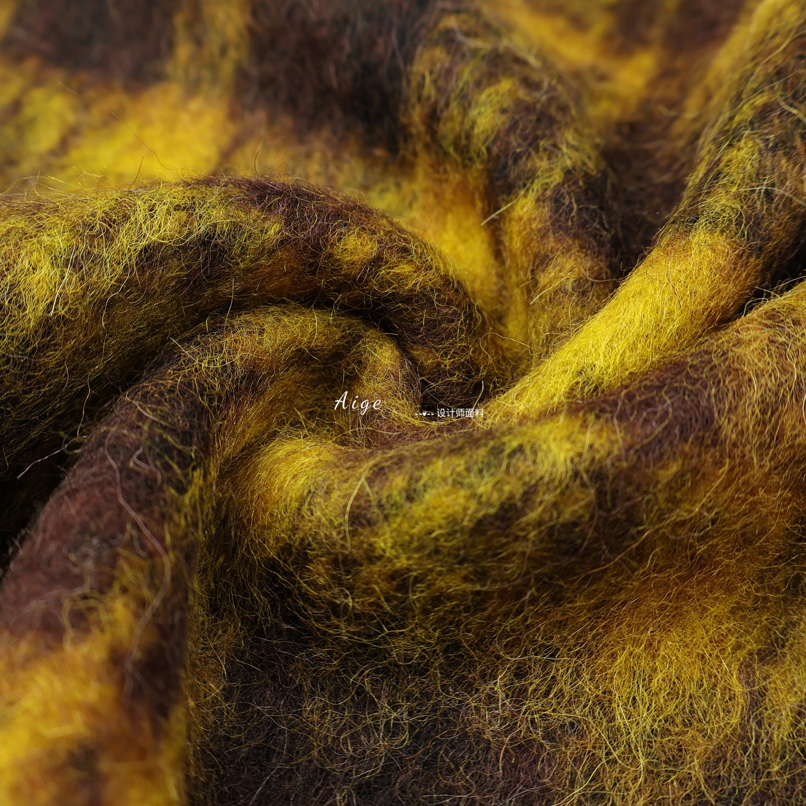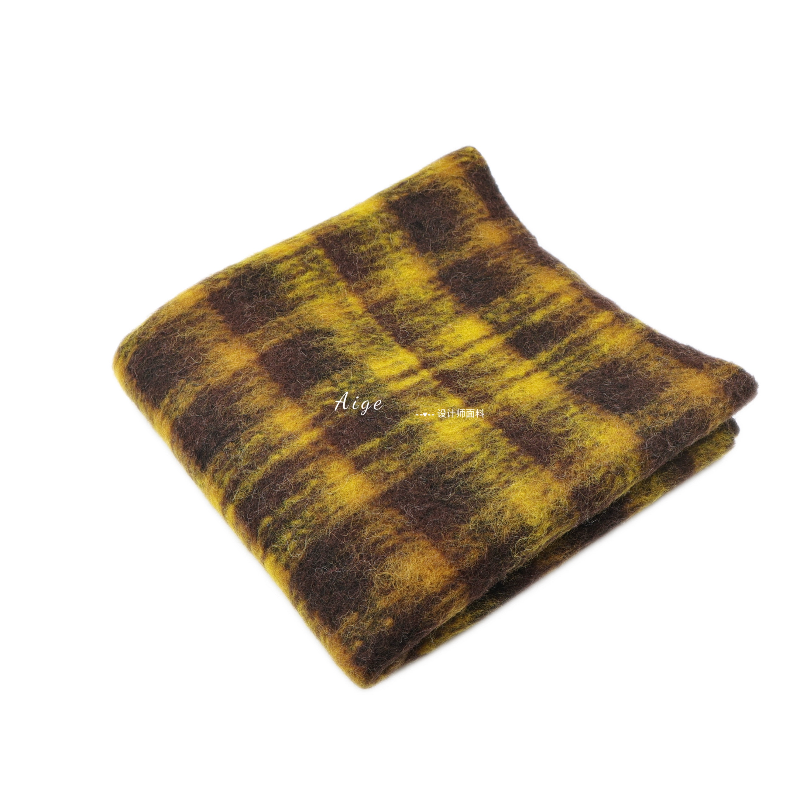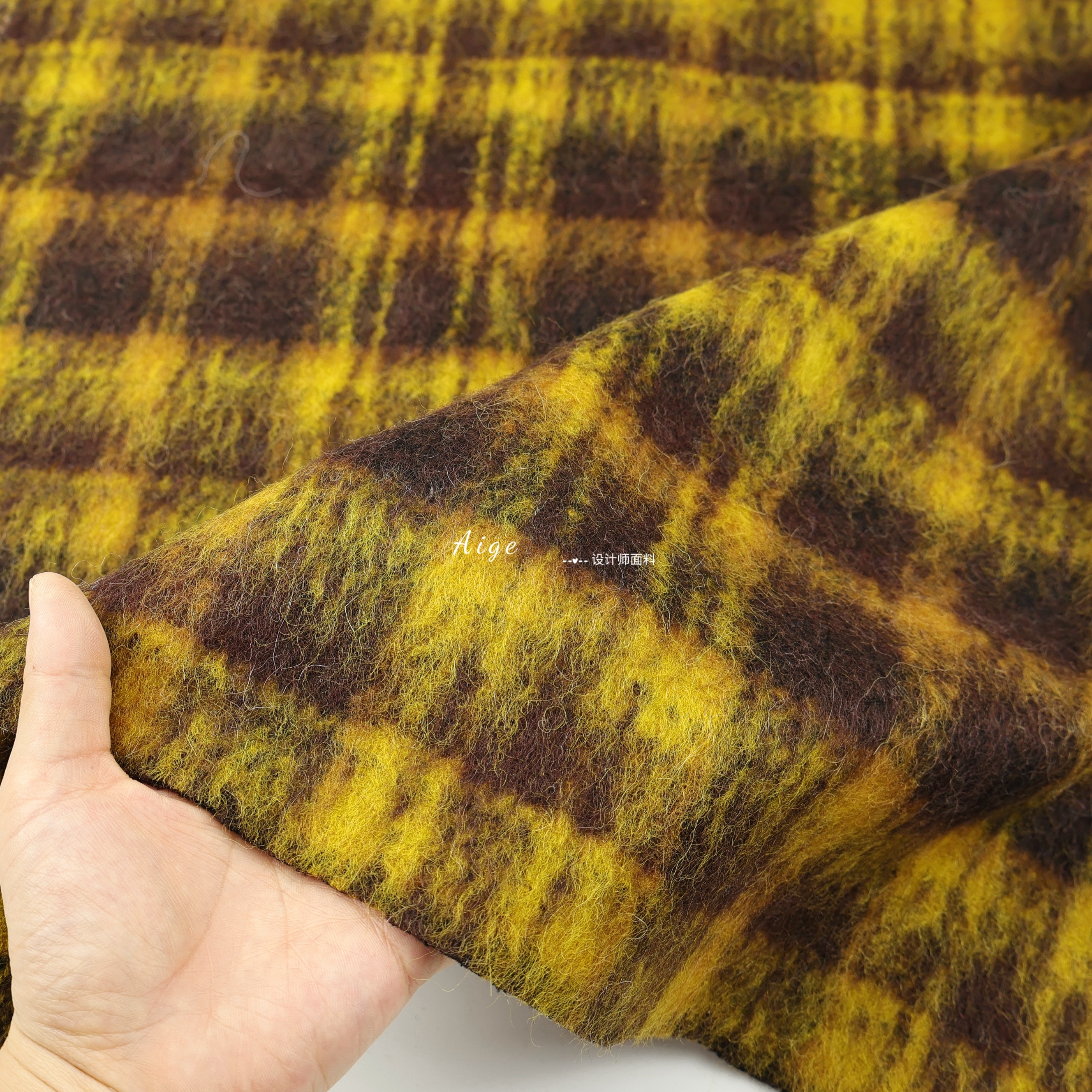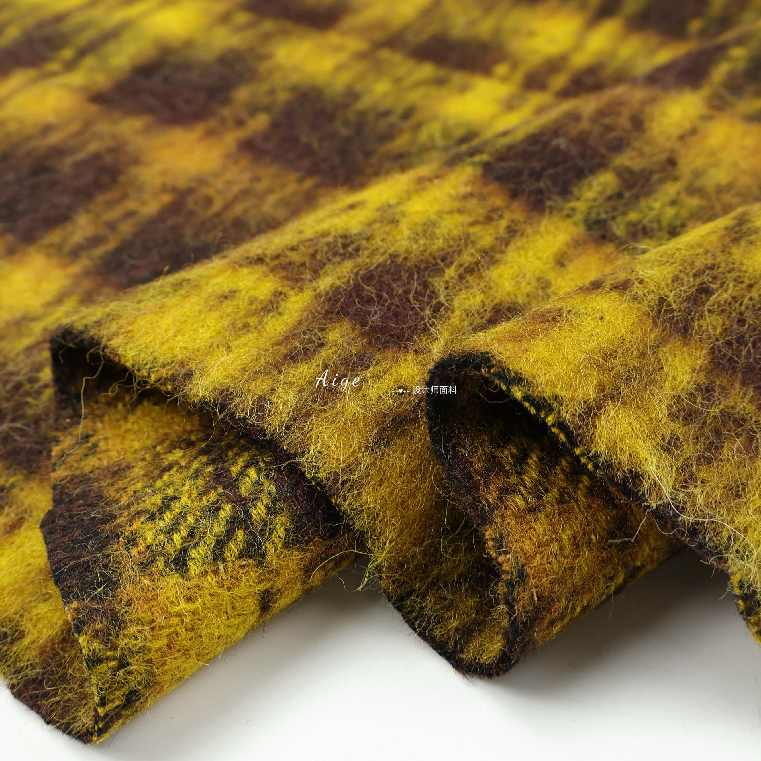 100%羊毛 黄棕色长毛羊驼毛羊毛格子毛料面料大衣外套风衣布料DIY