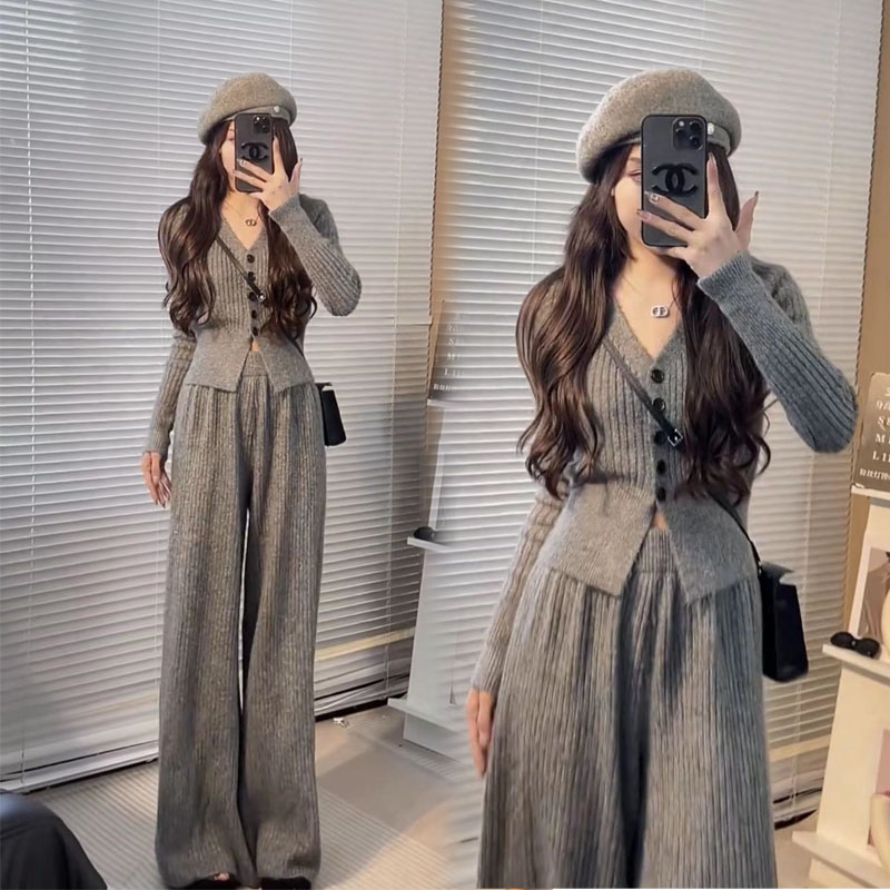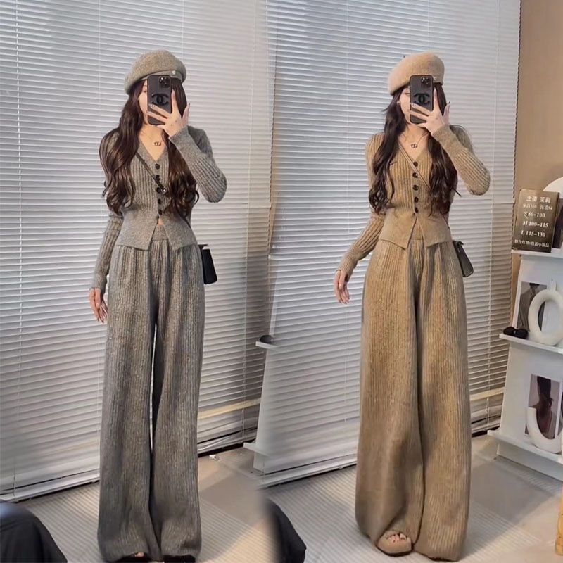 针织衫V领休闲时尚套装女阔腿裤