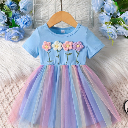 外贸INS婴幼小童女宝宝夏季款短袖立体花朵拼接彩色网纱连衣裙潮