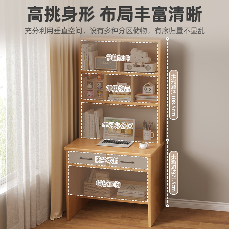 实木书桌书架一体书柜家用学生学习写字桌子卧室靠墙小户型电脑桌