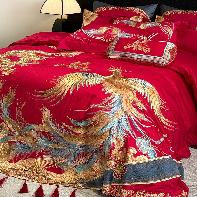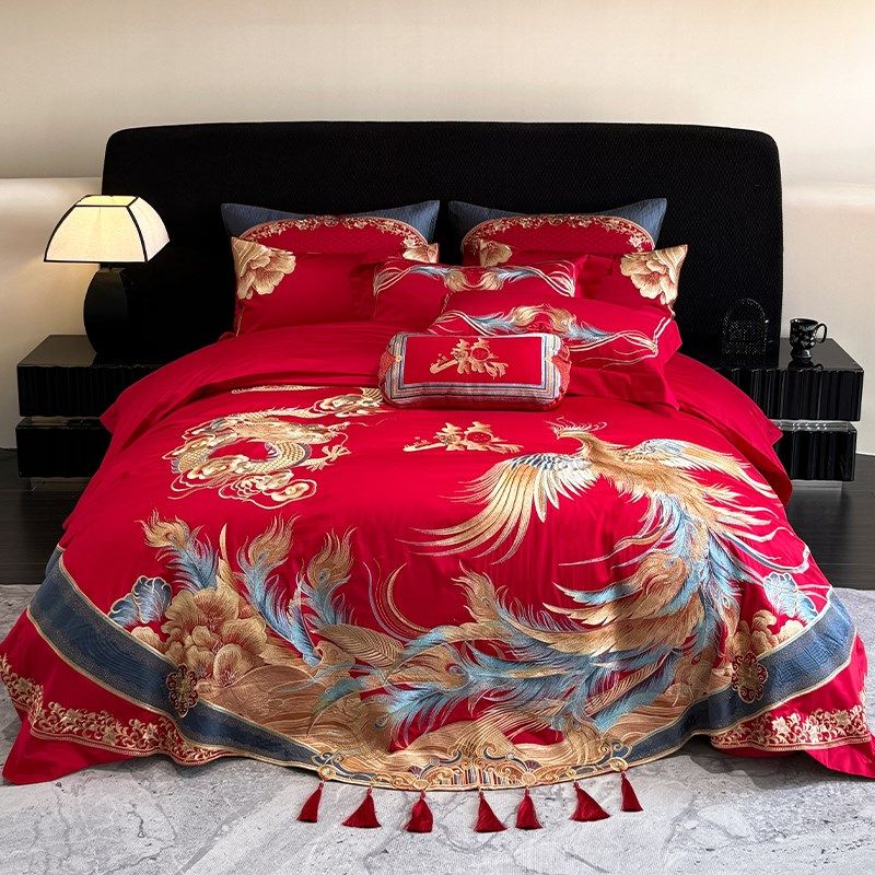 中式龙凤新婚庆床品四件套全棉100支刺绣大红色结婚房2米被套床单