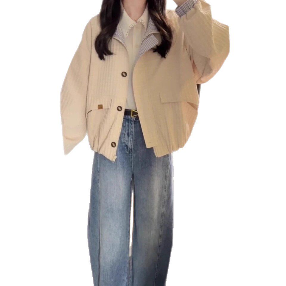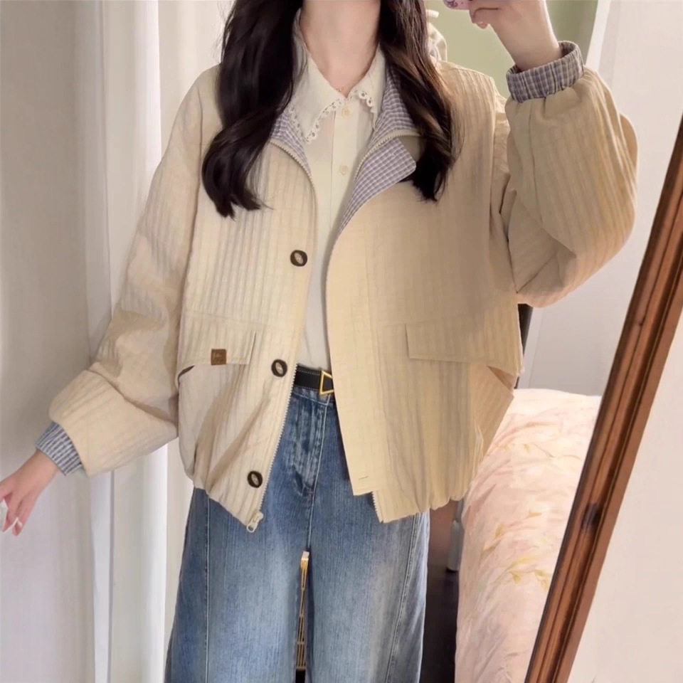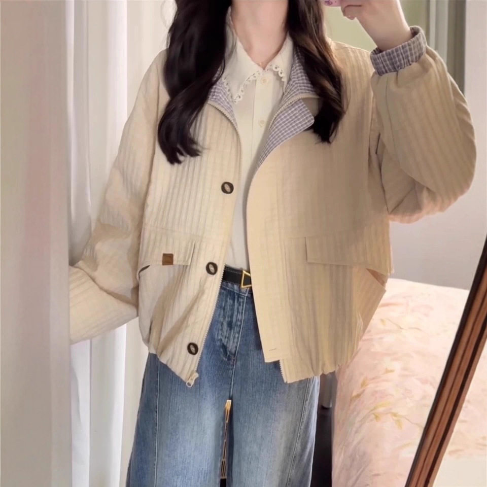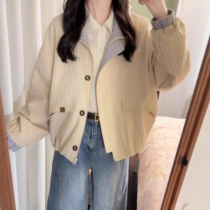 早秋日系短款夹克外套女款秋2025新款小个子休闲立领格纹撞色上衣
