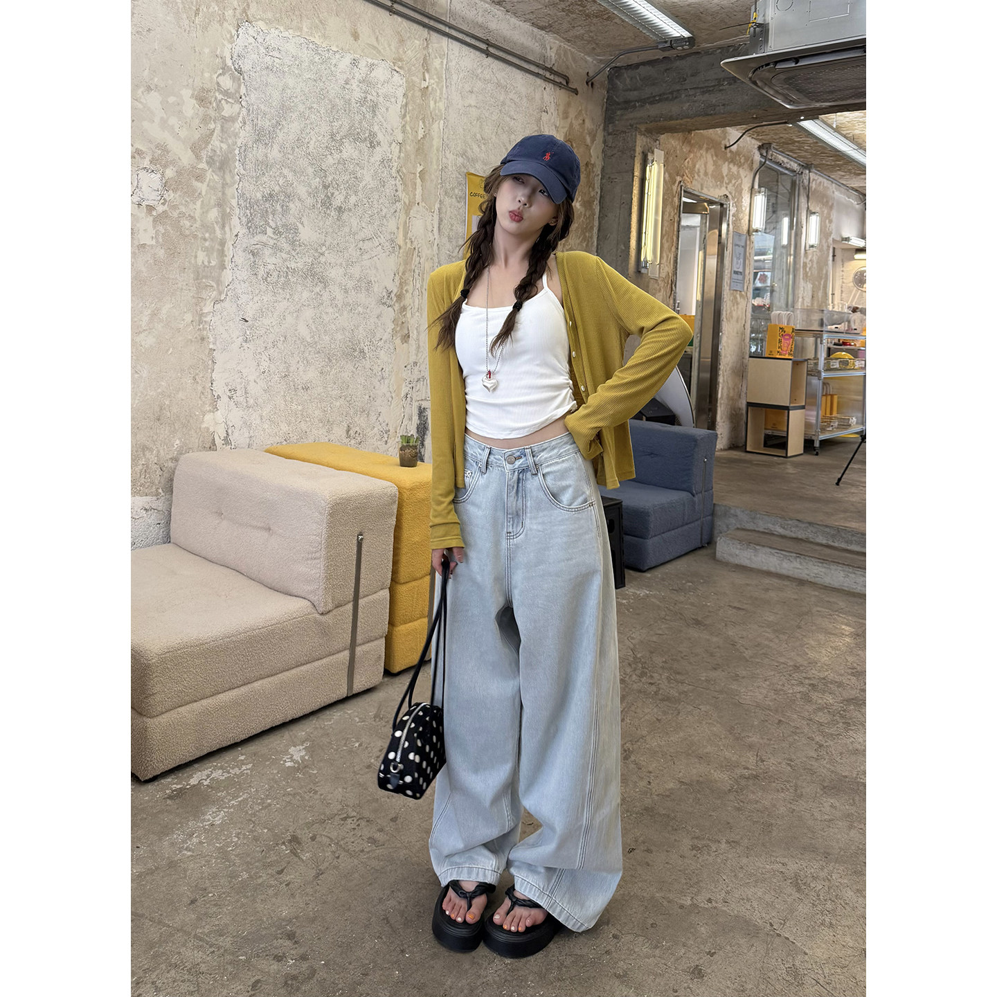 荒荒家 浅蓝色弯刀牛仔裤2025夏季新款薄款直筒高腰阔腿休闲裤女