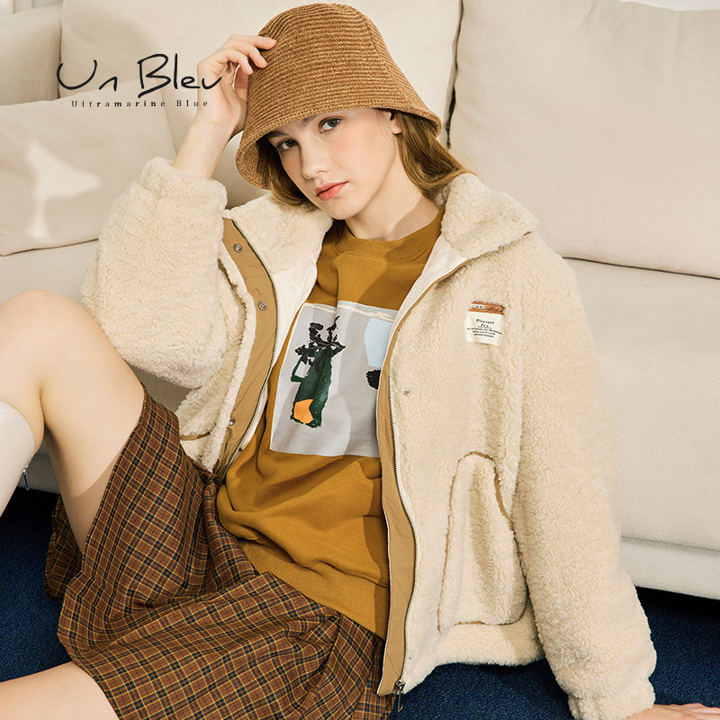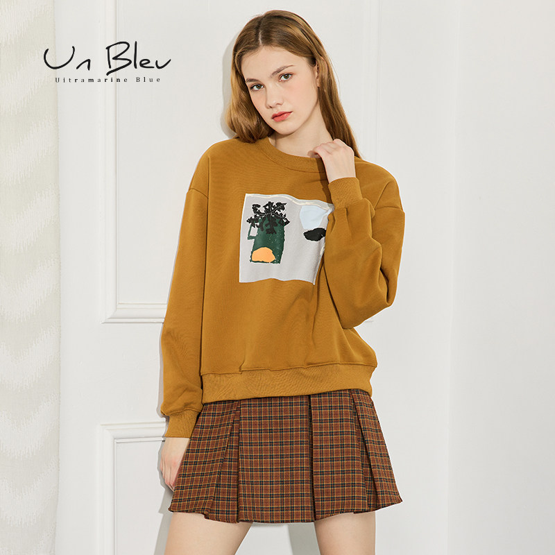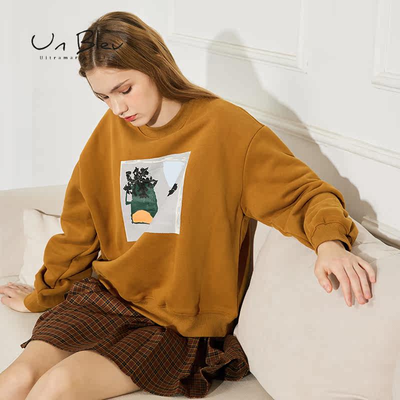 UnBleu卫衣女加绒加厚秋冬新款宽松休闲印花圆领套头短款上衣