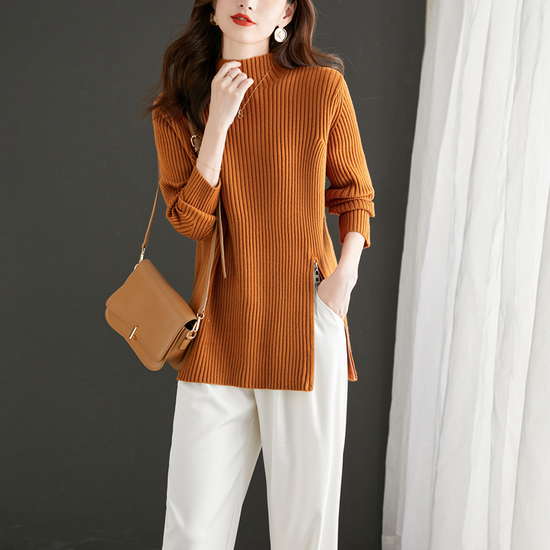 打底衫女秋冬内搭可外穿针织衫半高领侧开叉上衣中长款遮屁股毛衣