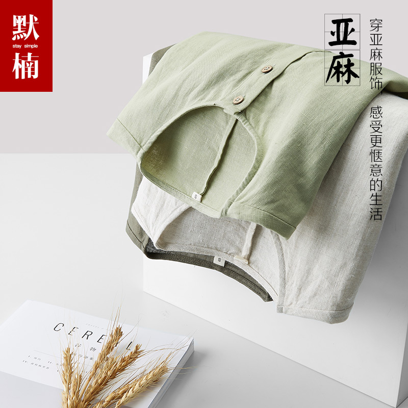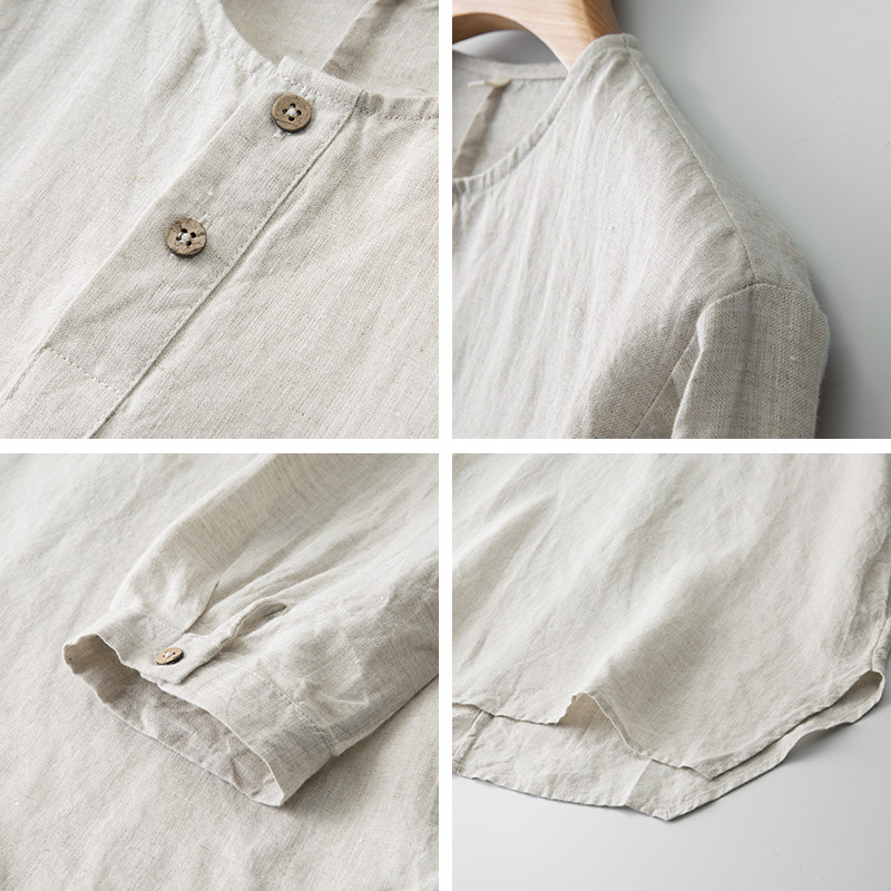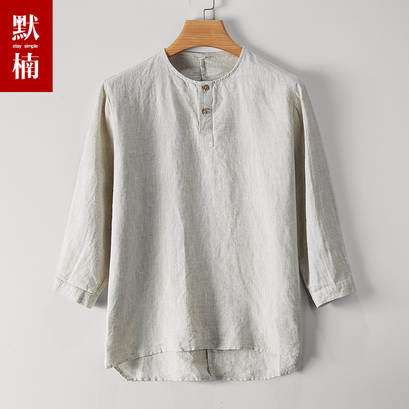 亚麻衬衫七分袖薄款男士复古潮流文艺衫休闲宽松圆领中袖T恤上衣