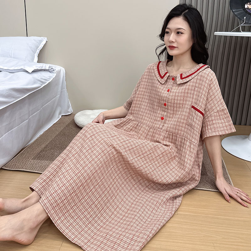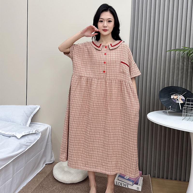 纯棉睡裙大码女胖mm可外穿夏季薄款双层棉纱格子连衣裙睡衣200斤