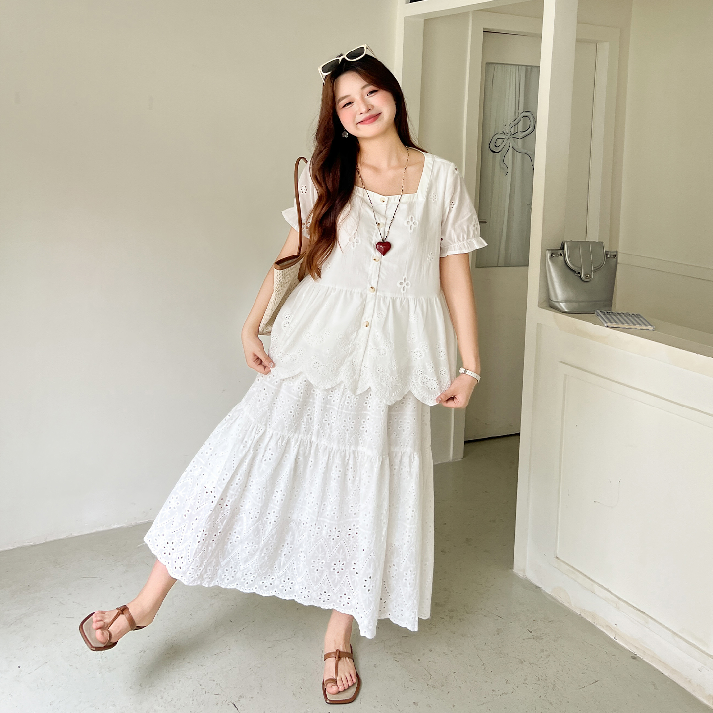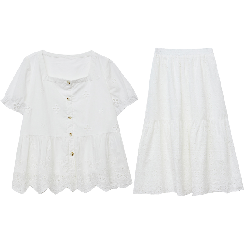 DM100大码百分百女装夏季胖mm纯棉遮肉显瘦重工刺绣上衣半裙套装