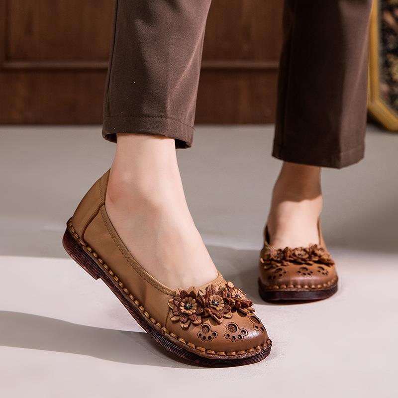 妈妈鞋真皮女平底花朵豆豆鞋复古牛筋软底中老年民族风浅口单鞋女