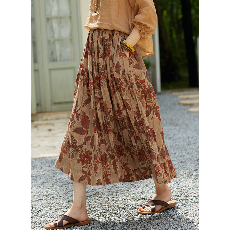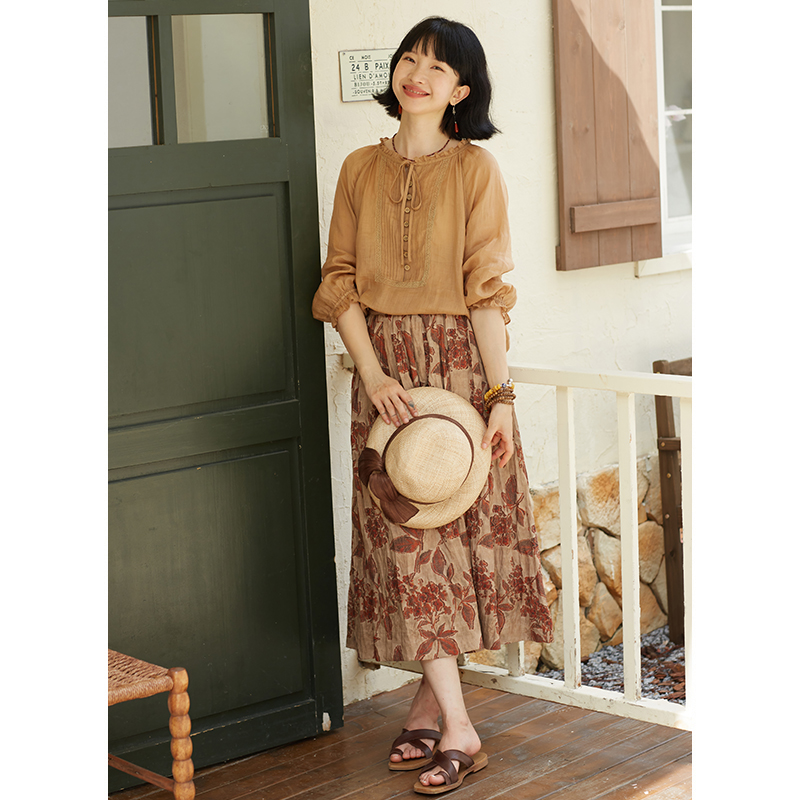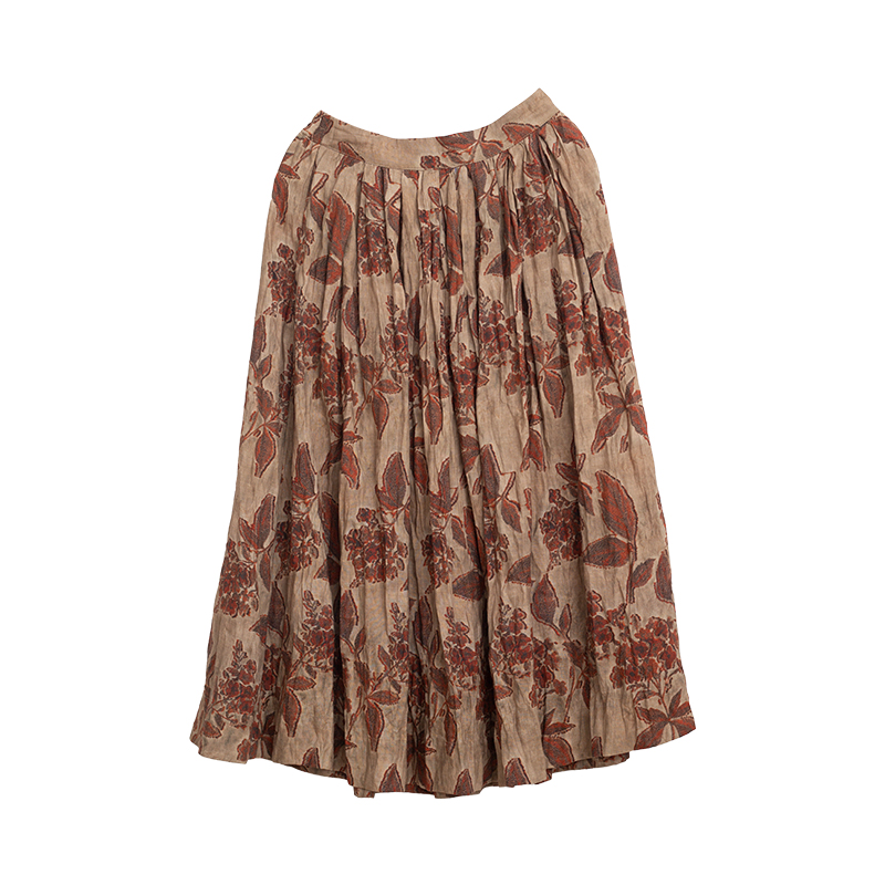 忘城文艺复古100%苎麻印花半身裙