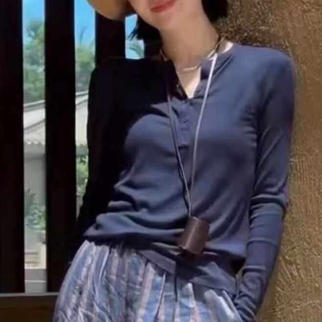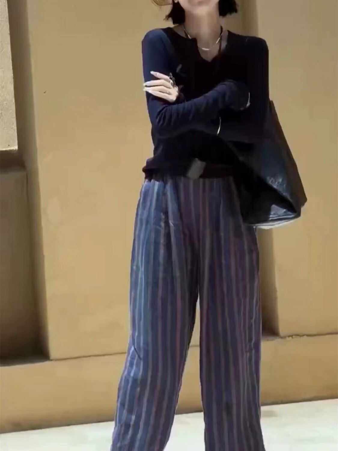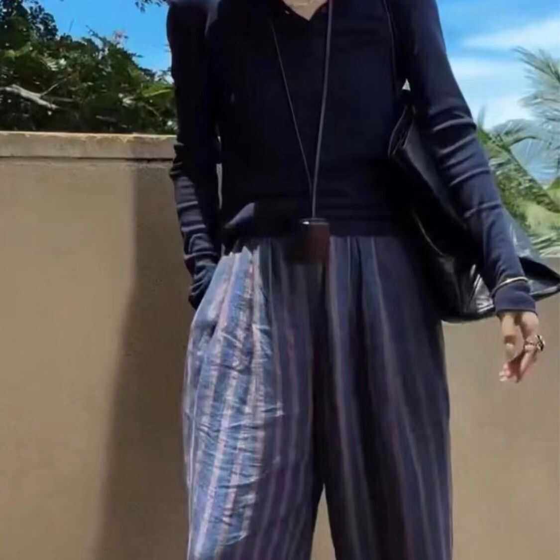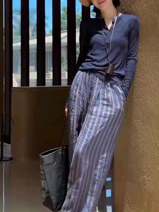 蓝色时尚套装女气质简约显瘦长袖T恤条纹阔腿裤秋装搭配一整套潮