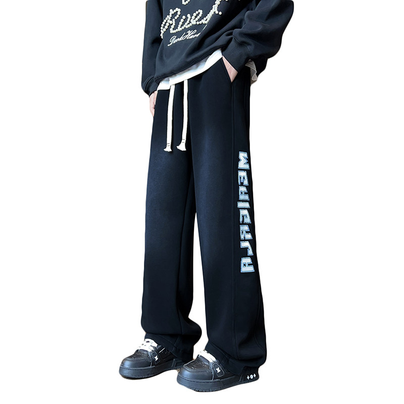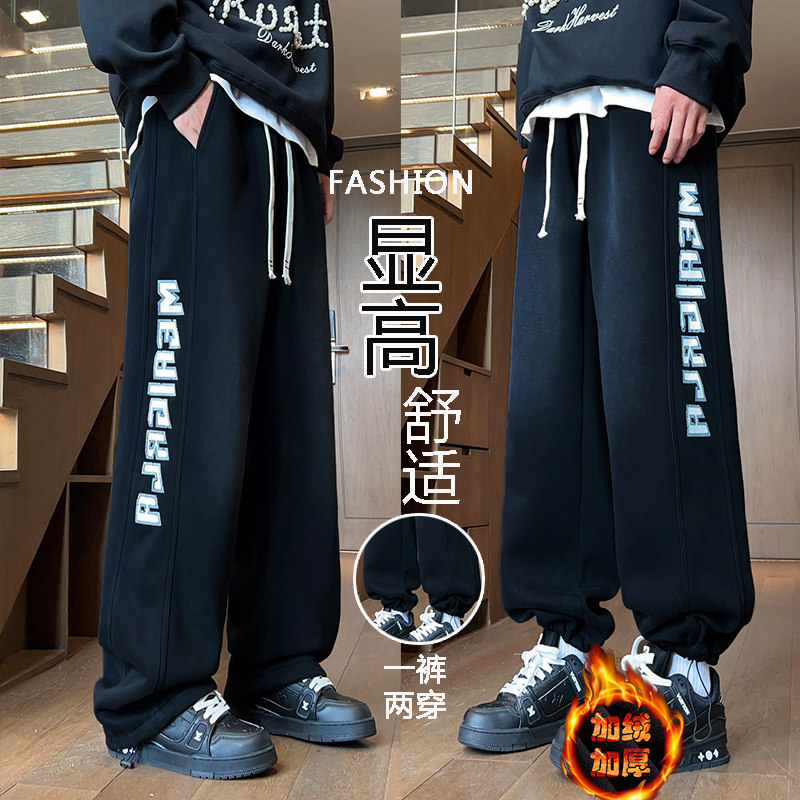 2025新款冬季青少年加绒加厚潮流宽松阔腿卫裤男款运动长裤子以純