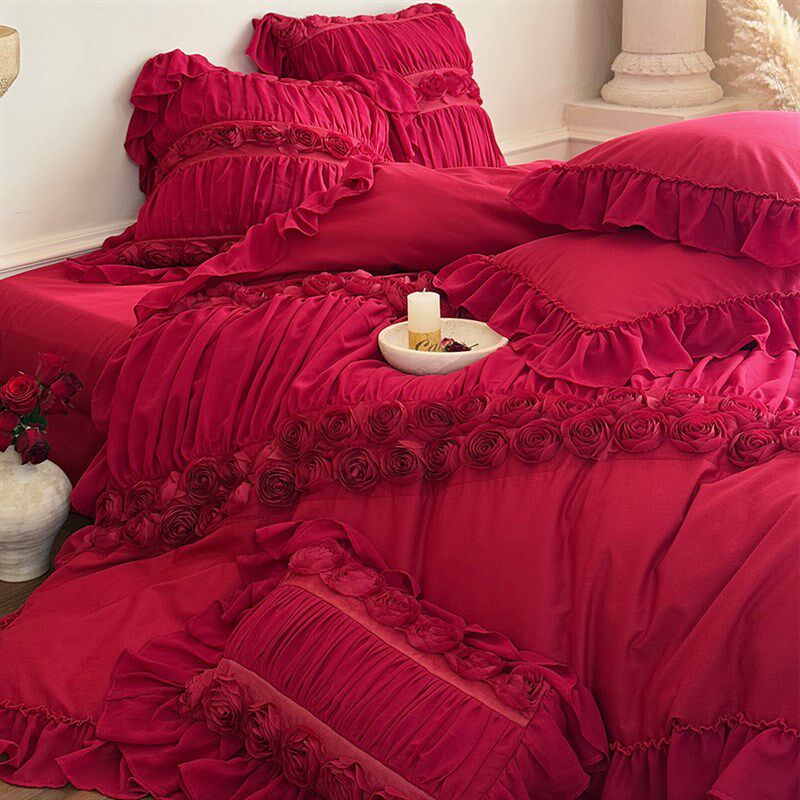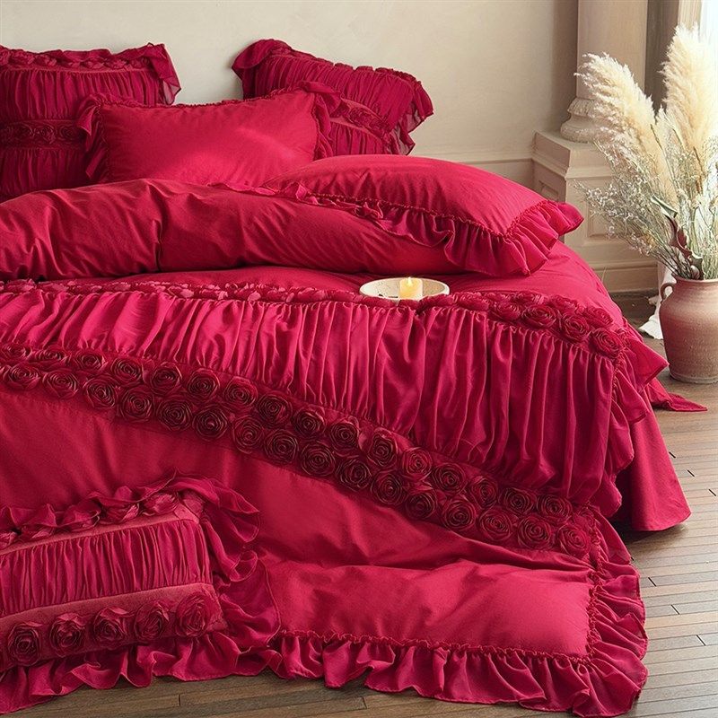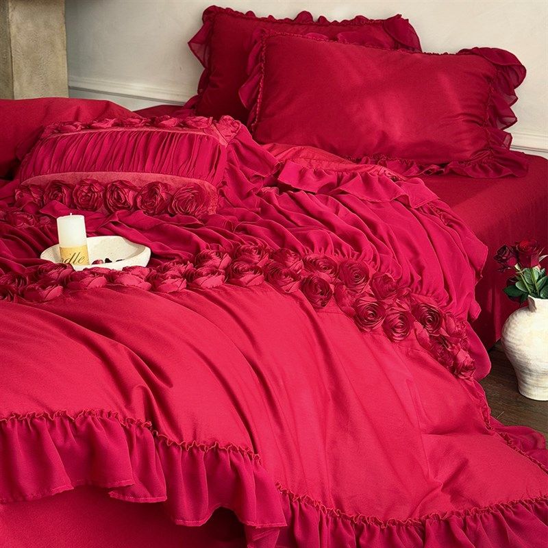春夏全棉婚庆四件套水洗棉法式浪漫立体玫瑰结婚红色被套床单床裙