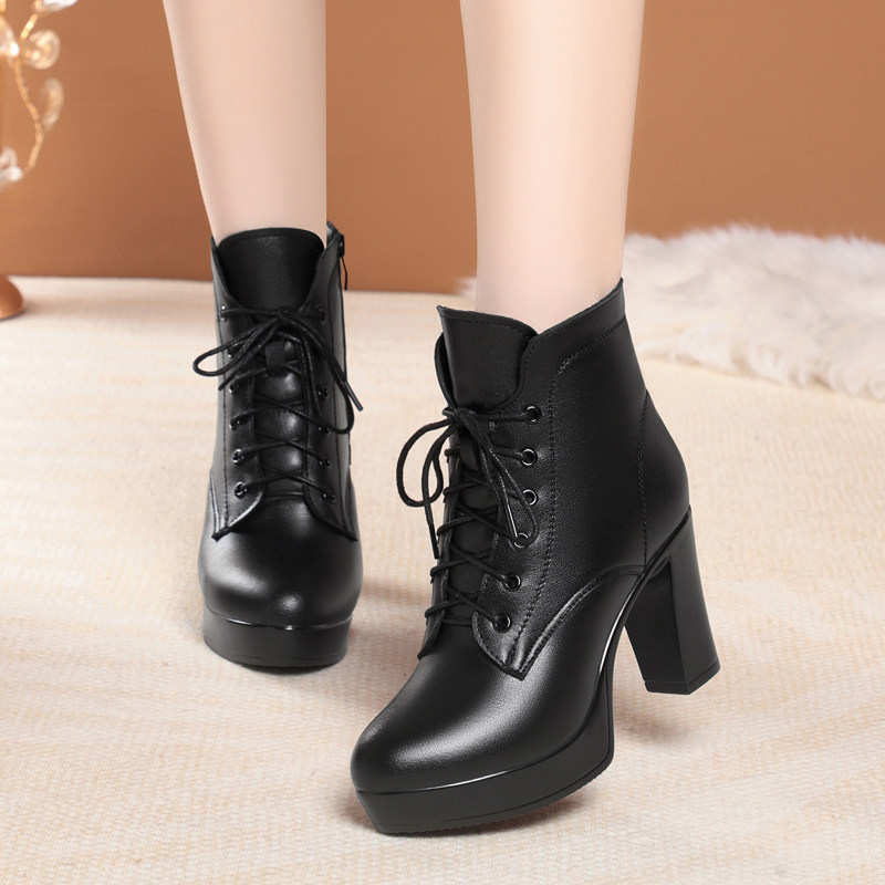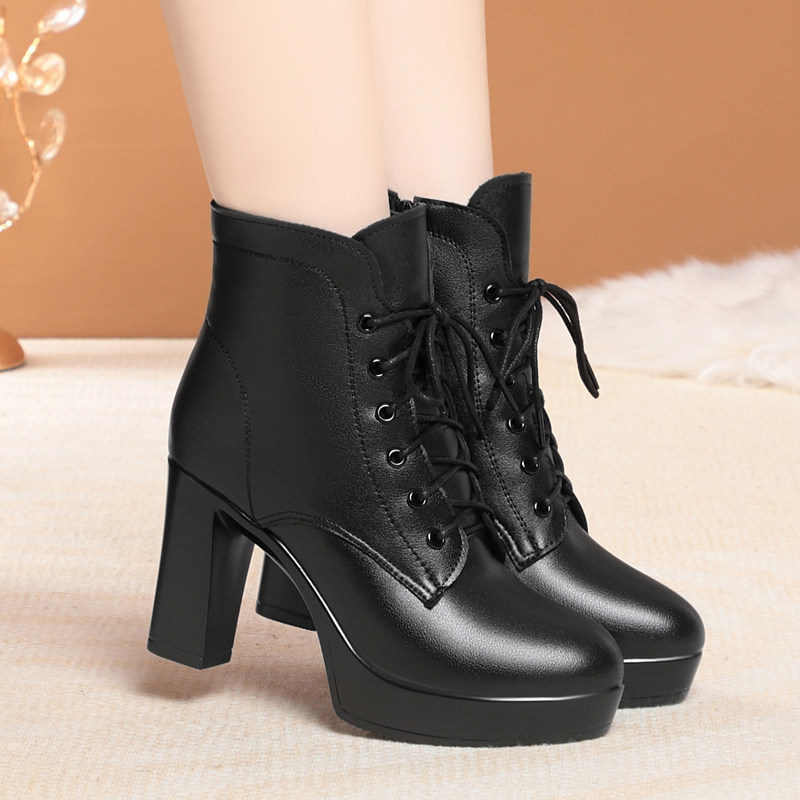 羊毛女靴2025新款冬季真皮高跟马丁靴女短靴粗跟防水台加绒棉皮鞋