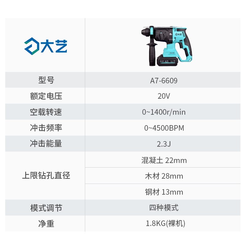 大艺充电电锤锂电钻大功率6609多功能无刷电镐家用轻型电动冲击钻