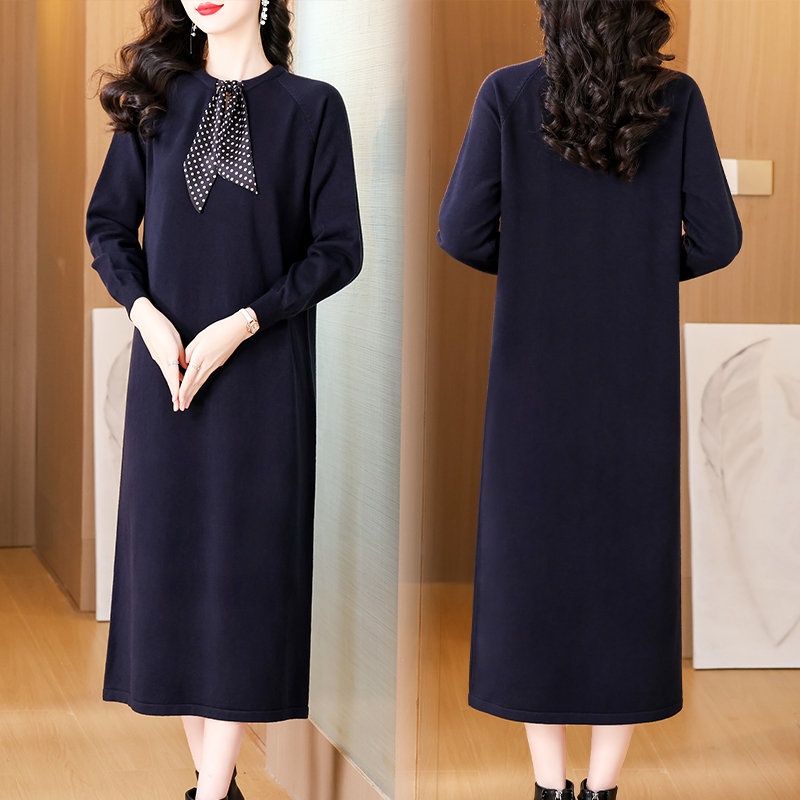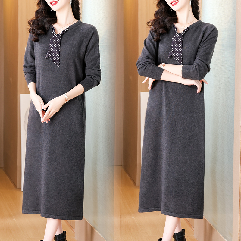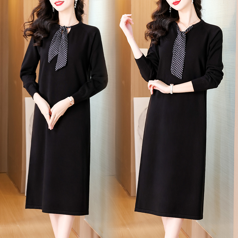 时尚波点丝巾针织爆款毛衣秋冬新款V领长袖宽松显瘦针织连衣裙女