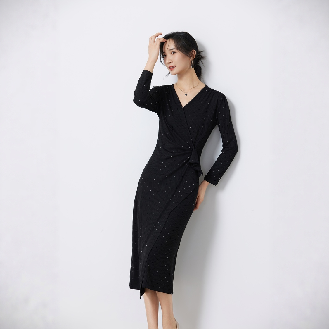 秋冬新款烫钻闪亮长袖红色连衣裙修身显瘦气质礼服宴会中长款裙子