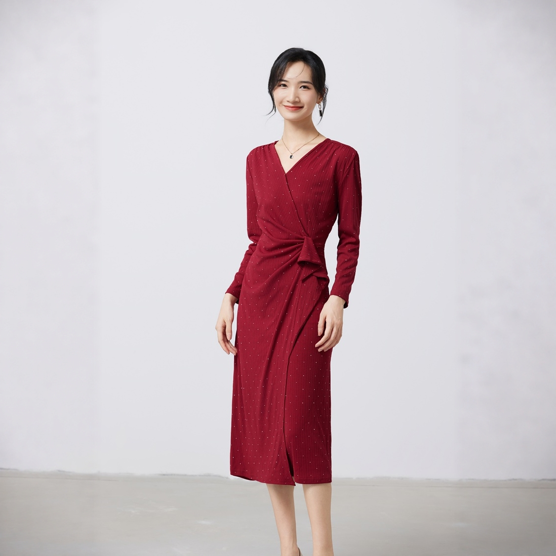 烫钻闪亮长袖红色连衣裙