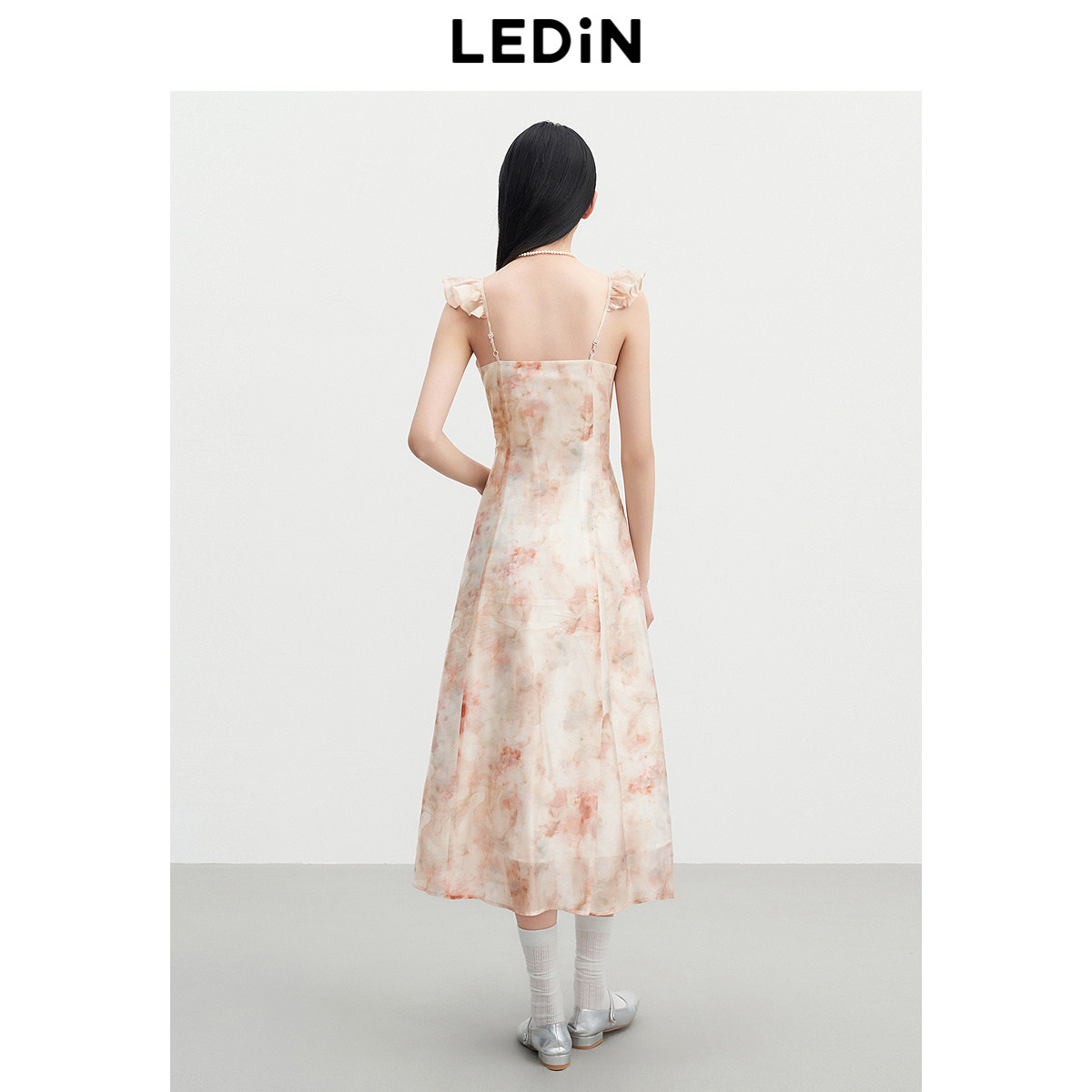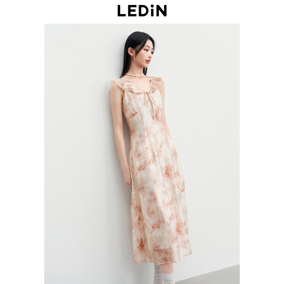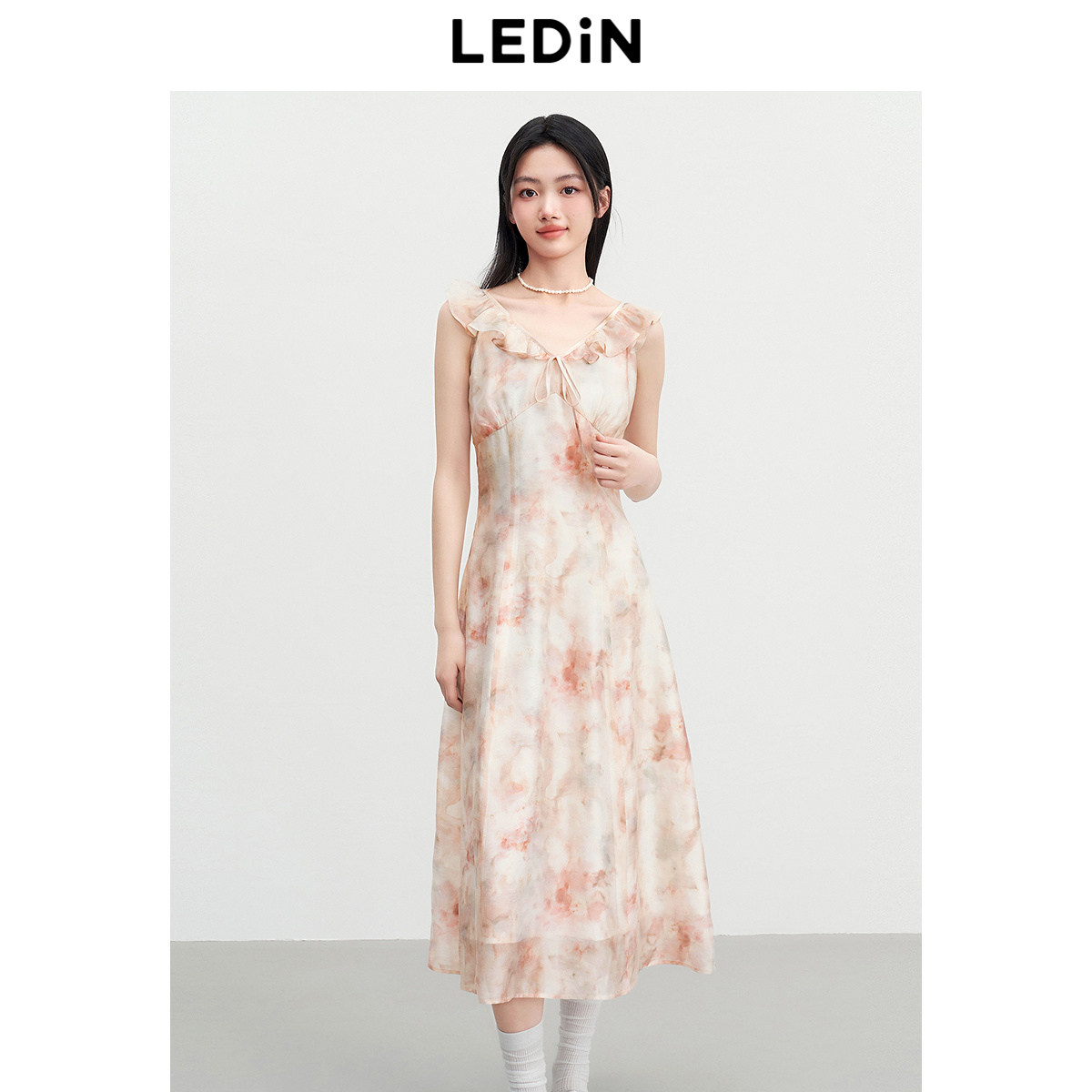 乐町晕染粉花长裙女夏季新款V领荷叶边浪漫飘逸约会裙韩系连衣裙