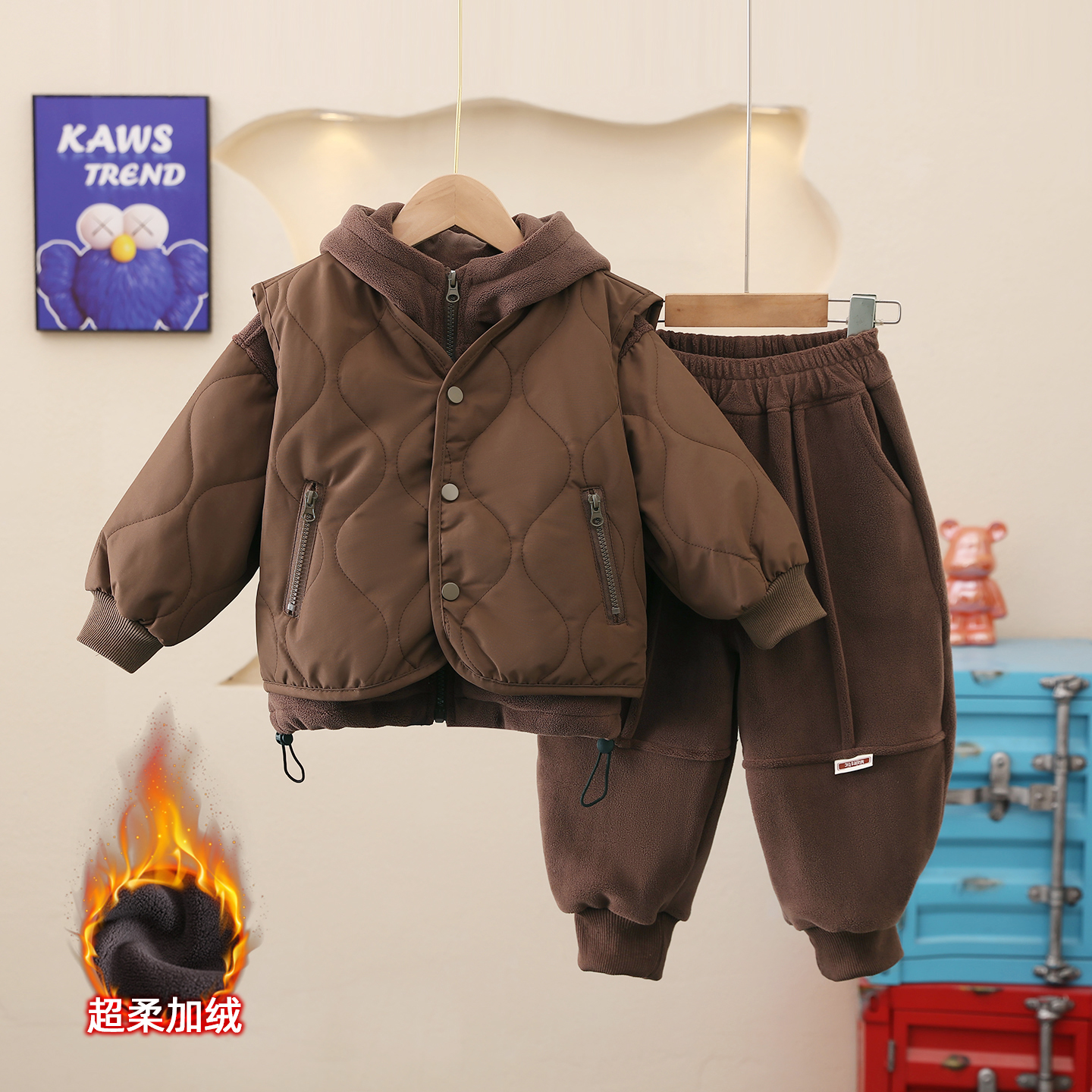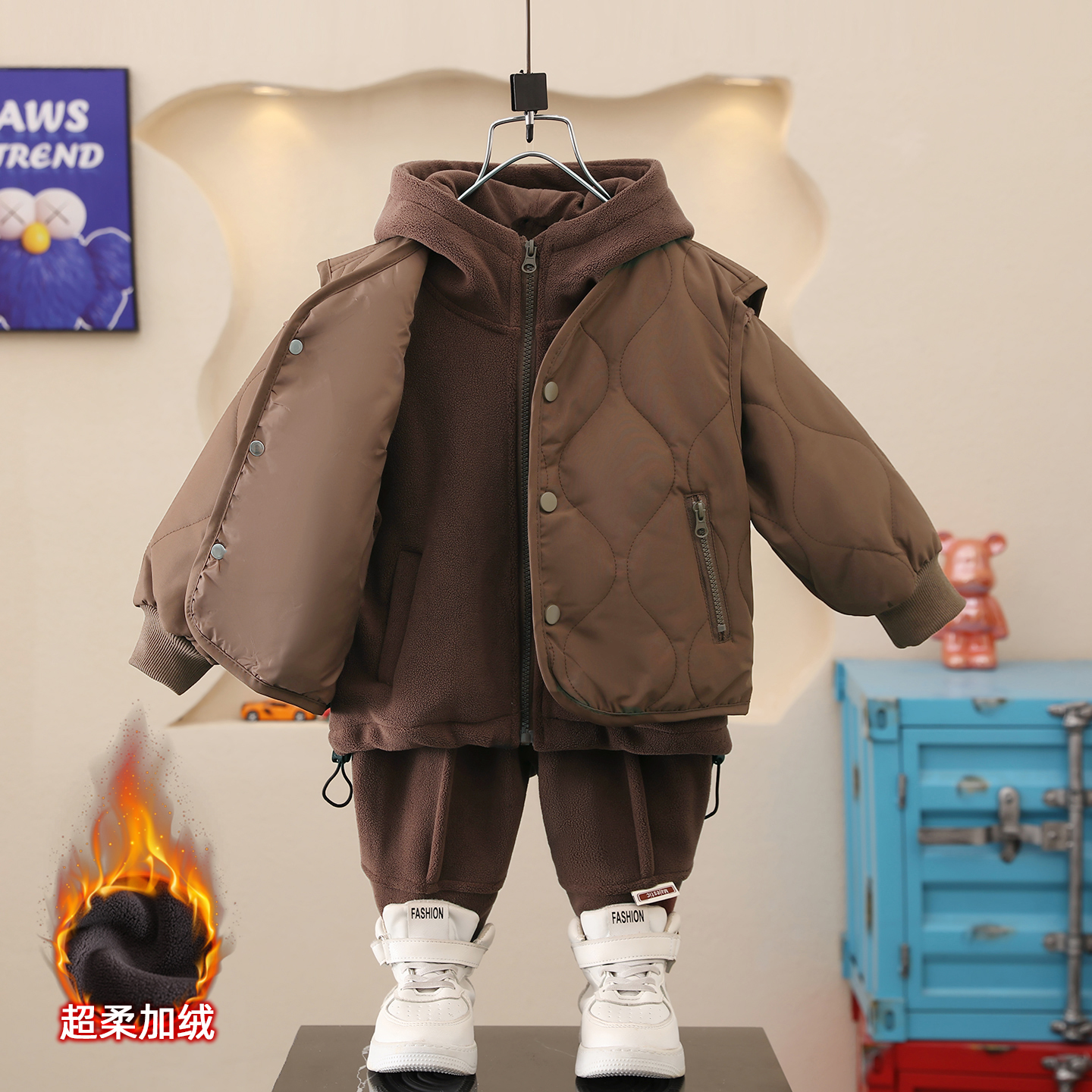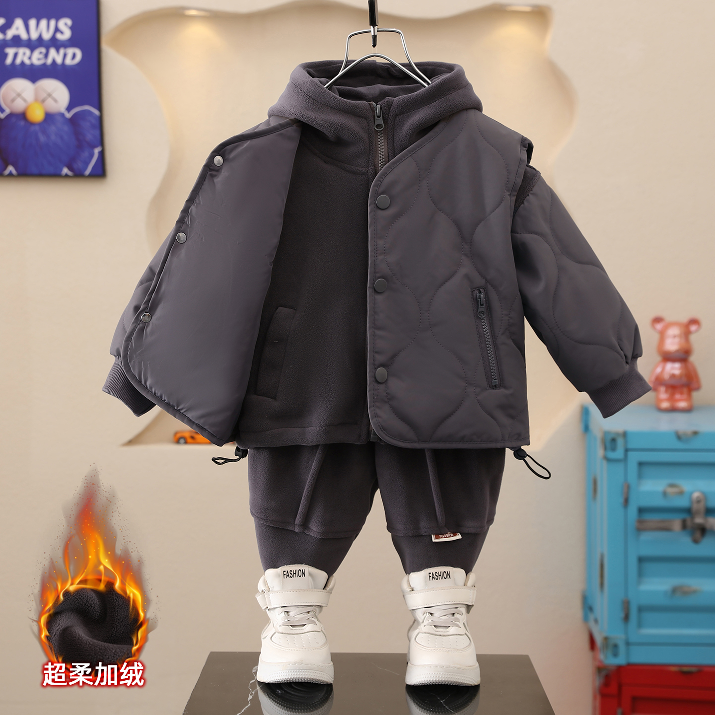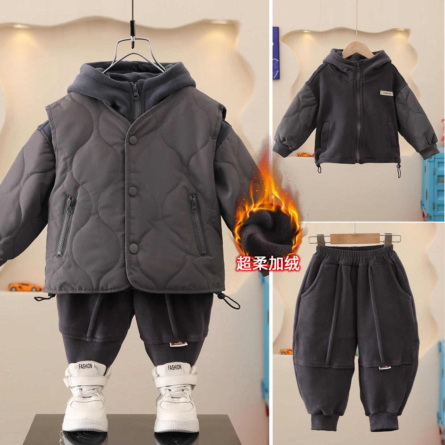 男童加绒套装加厚卫衣宝宝棉马甲儿童连帽棉衣服男孩三件套秋冬款