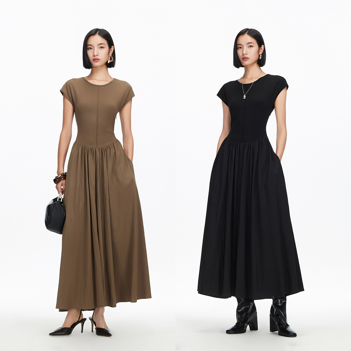 Vero Moda连衣裙2025秋季新款圆领纯色拼接伞裙优雅大气32537A023