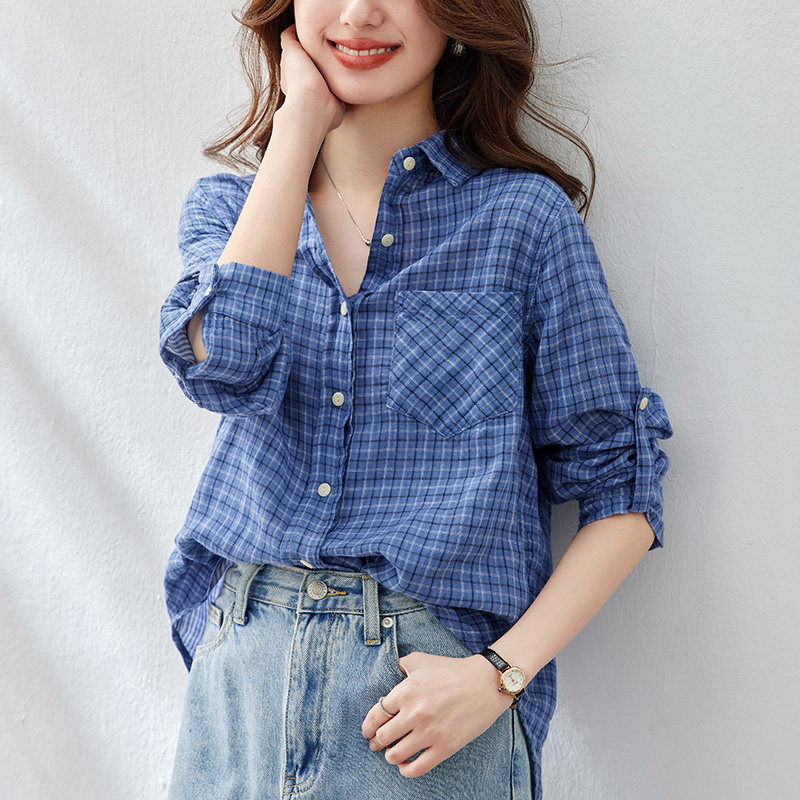 自留款推荐~蓝色气质高级格子衬衫2025春夏复古格纹宽松休闲上衣