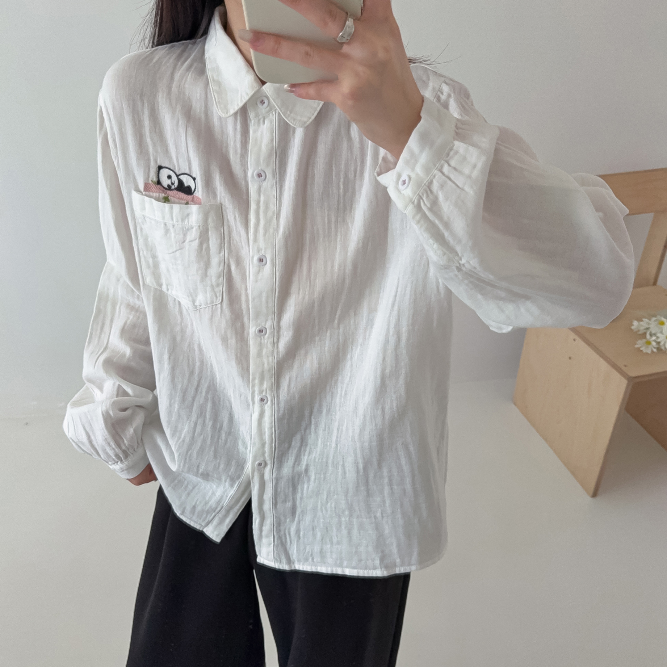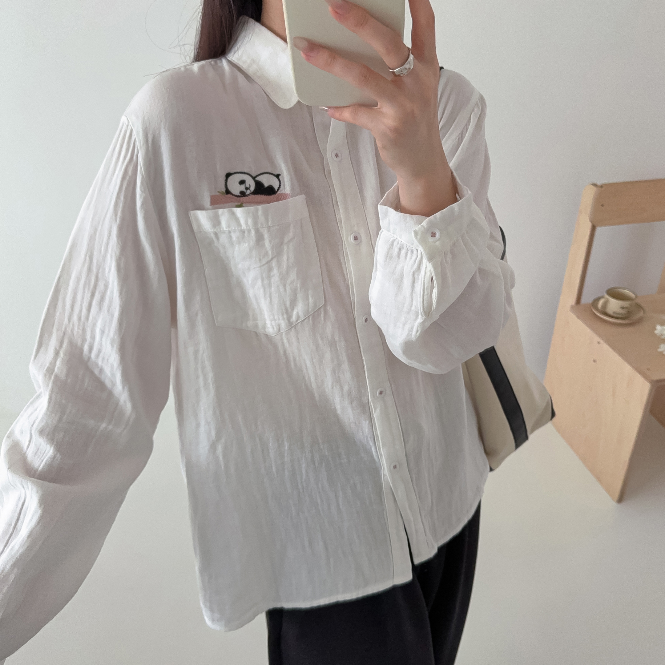 熊猫刺绣白色长袖衬衫女宽松翻领衬衣休闲上衣双层棉纱柔软打底衫