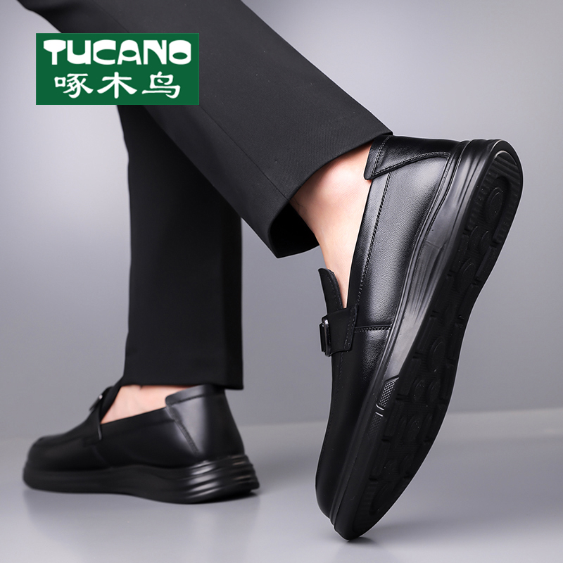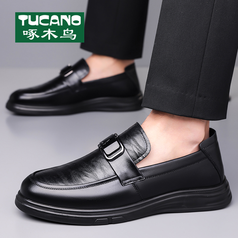啄木鸟皮鞋男款真皮正装商务休闲鞋春秋季圆头英伦软底套脚一脚蹬