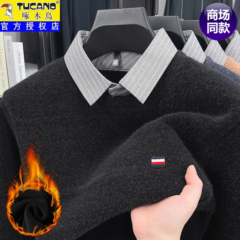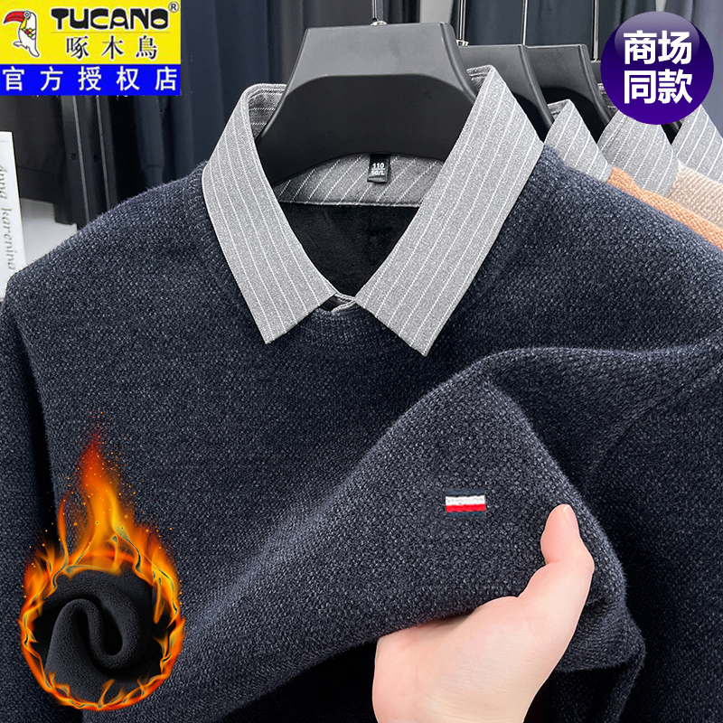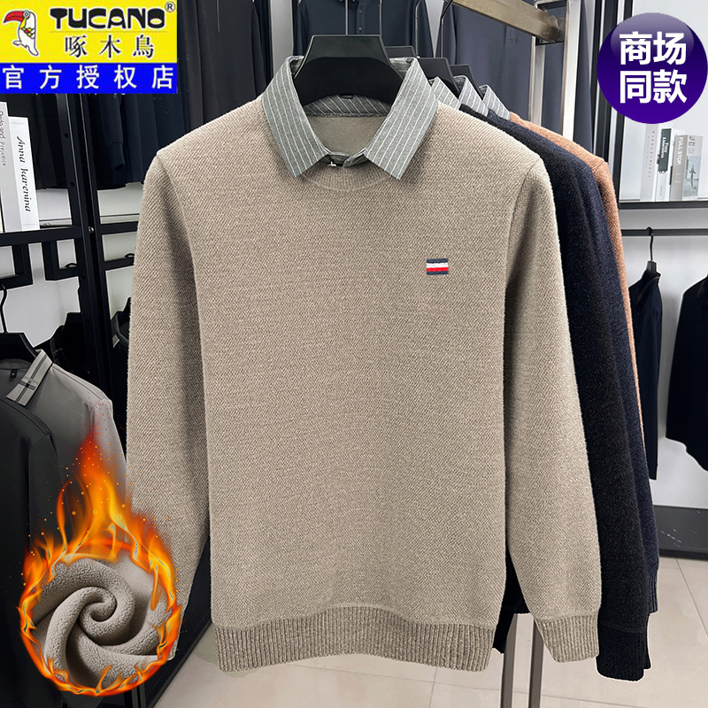 啄木鸟假两件毛衣男士加绒加厚冬装一体绒保暖衬衫领打底羊毛衫男