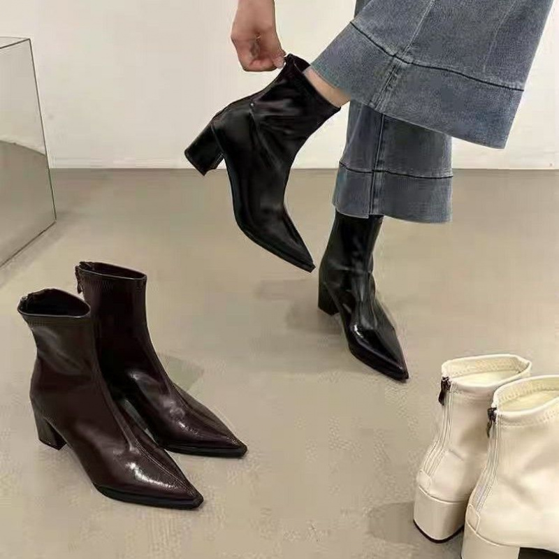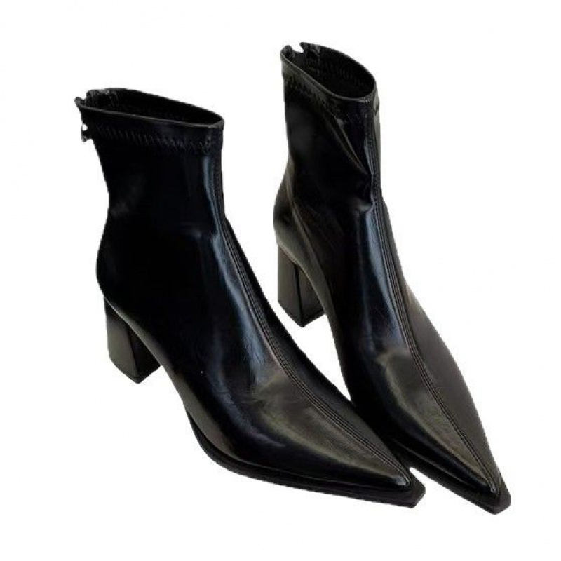 尖头粗跟单靴短靴女高跟鞋2025秋冬女靴子时装中跟马丁瘦瘦靴拉链