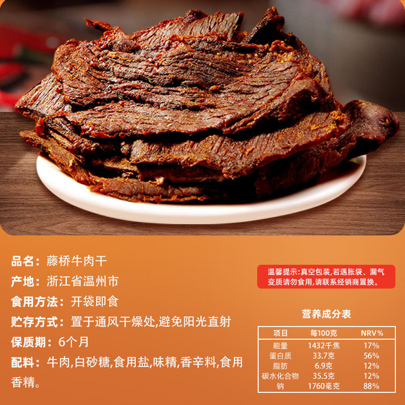 【热卖10000+】藤桥牌温州特产湖岭手撕牛肉干大片桶装250g*2