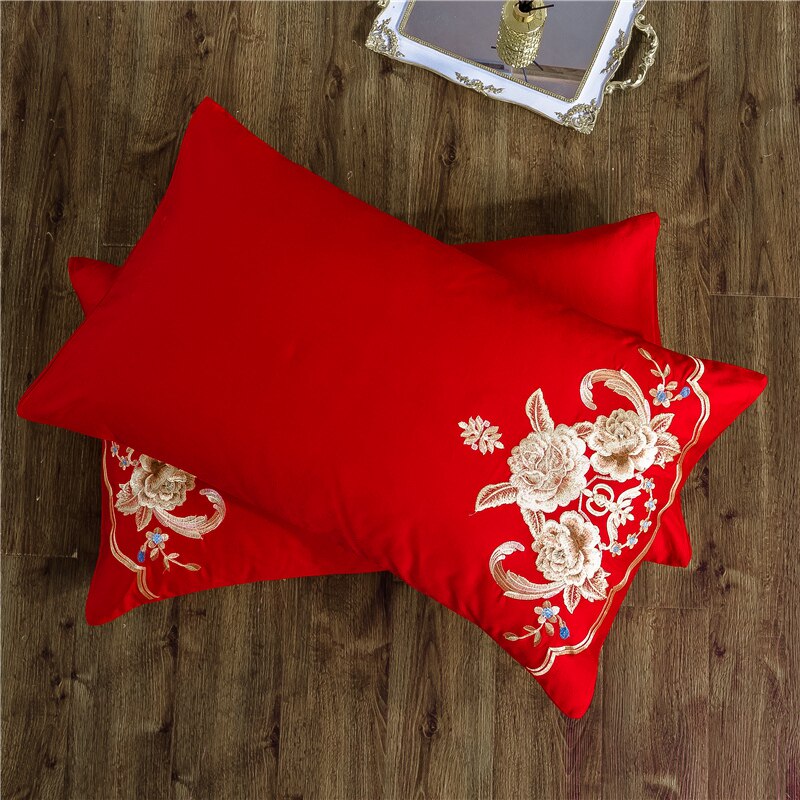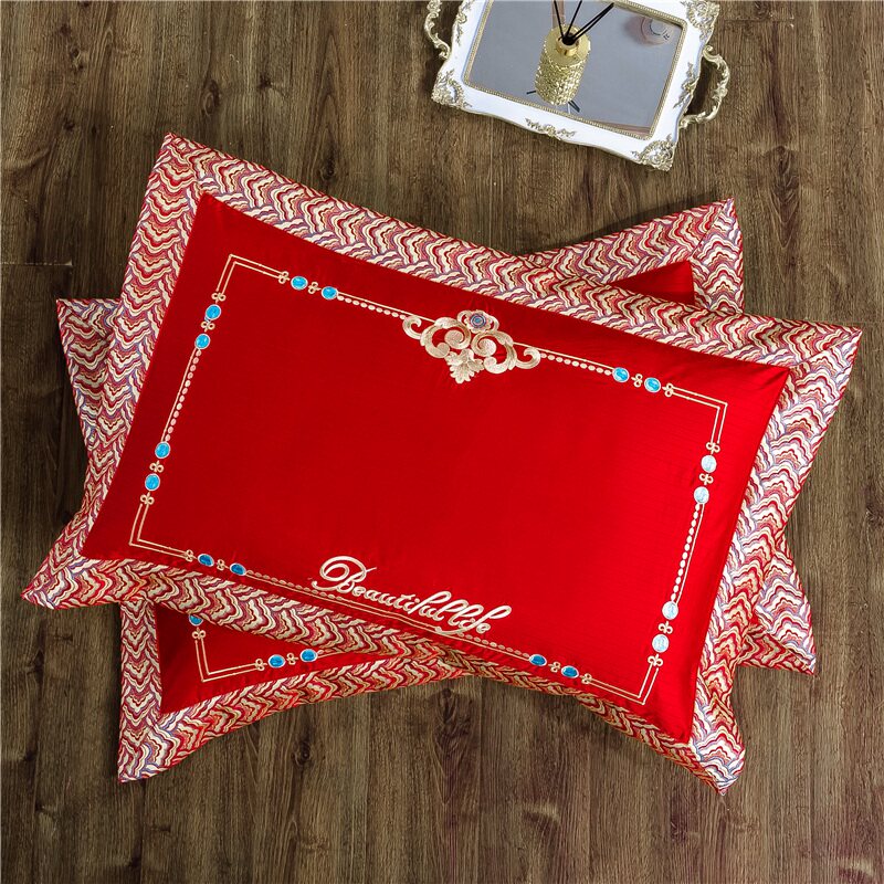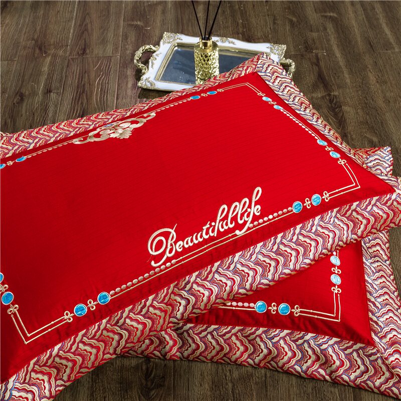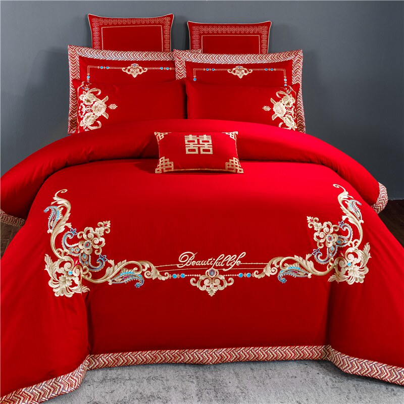 简约新中式双喜刺绣婚庆四件套全棉100S长绒棉酒红色结婚被套床单