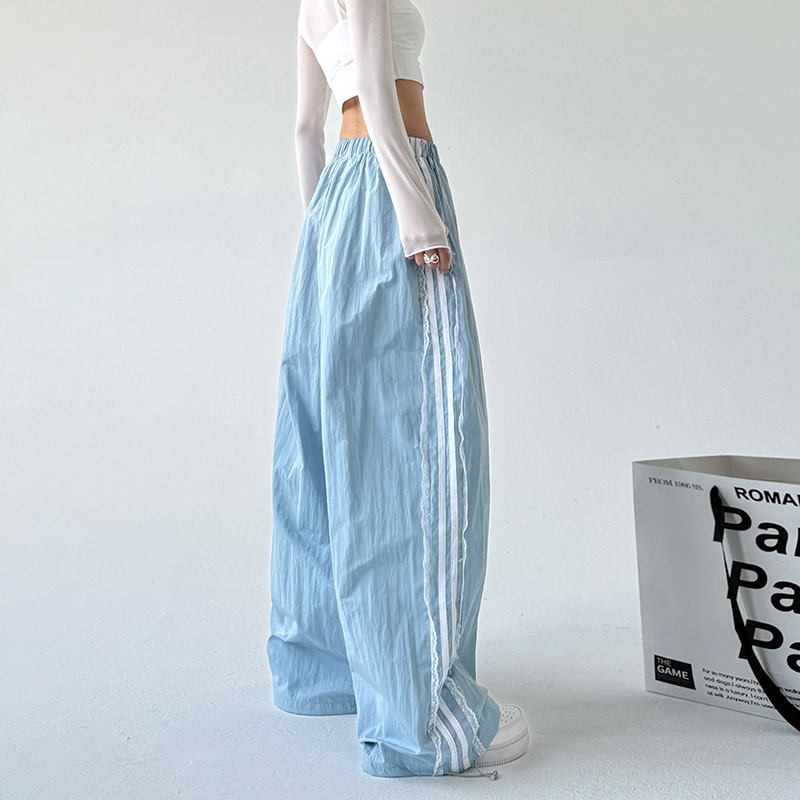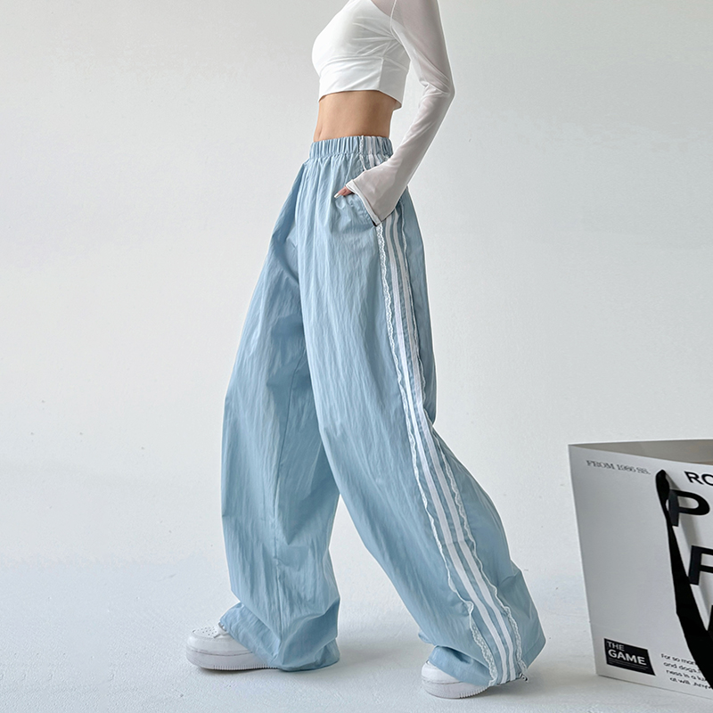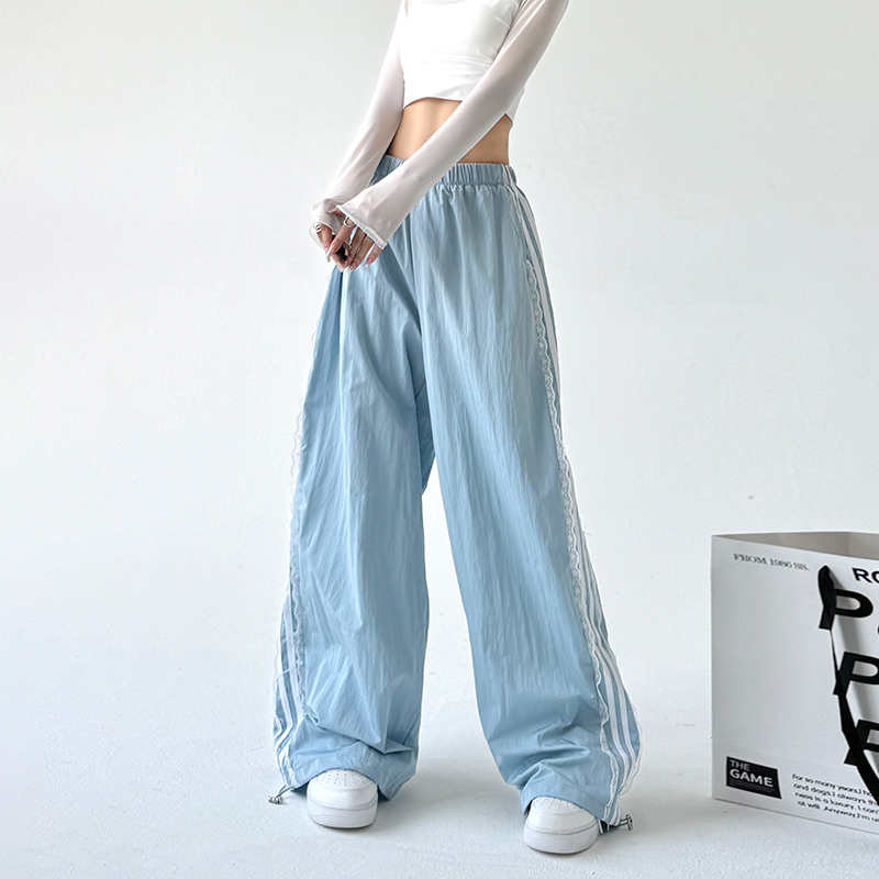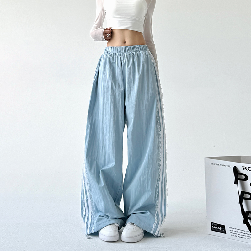 美式蕾丝边条纹运动裤女春秋新款2025高腰休闲宽松阔腿工装长裤子