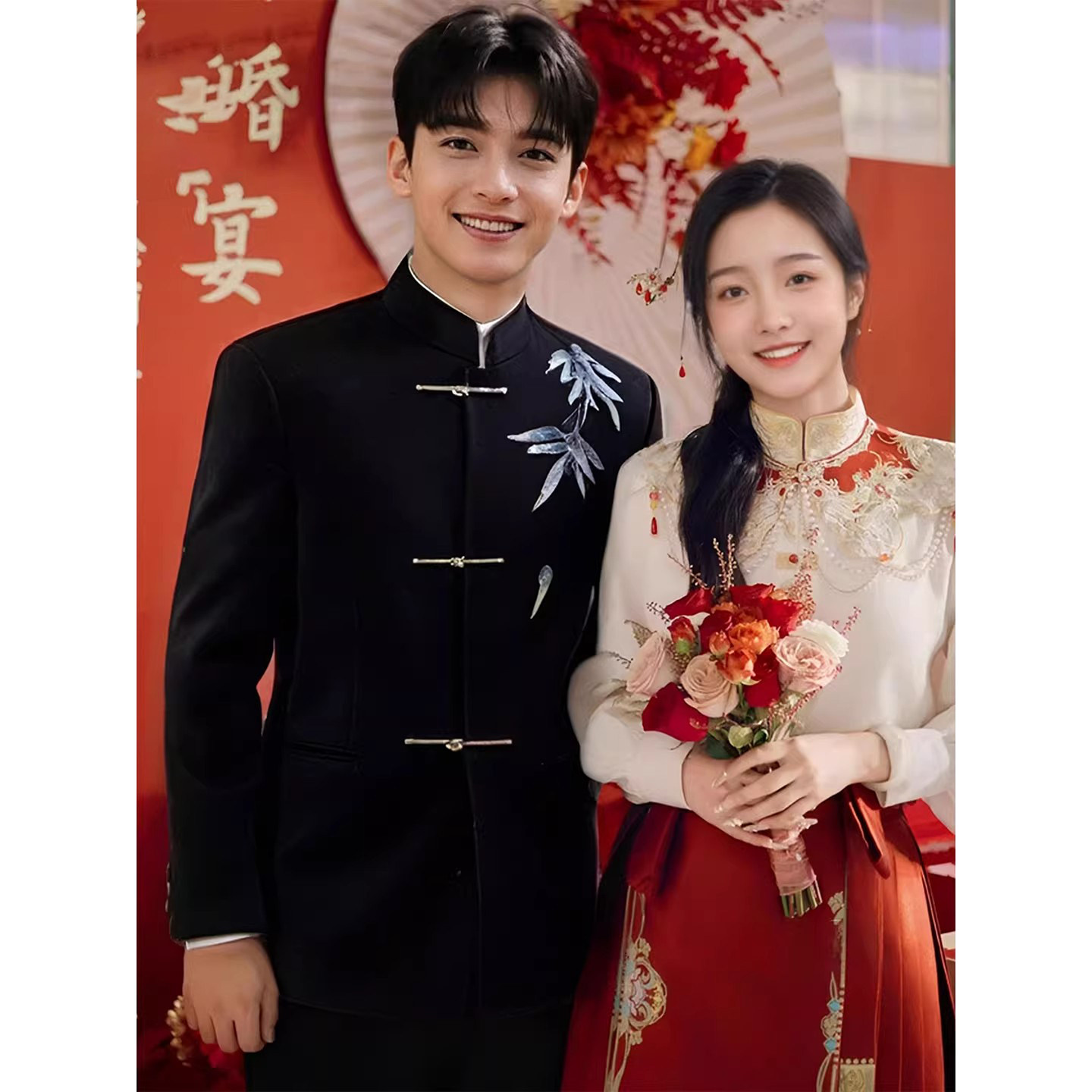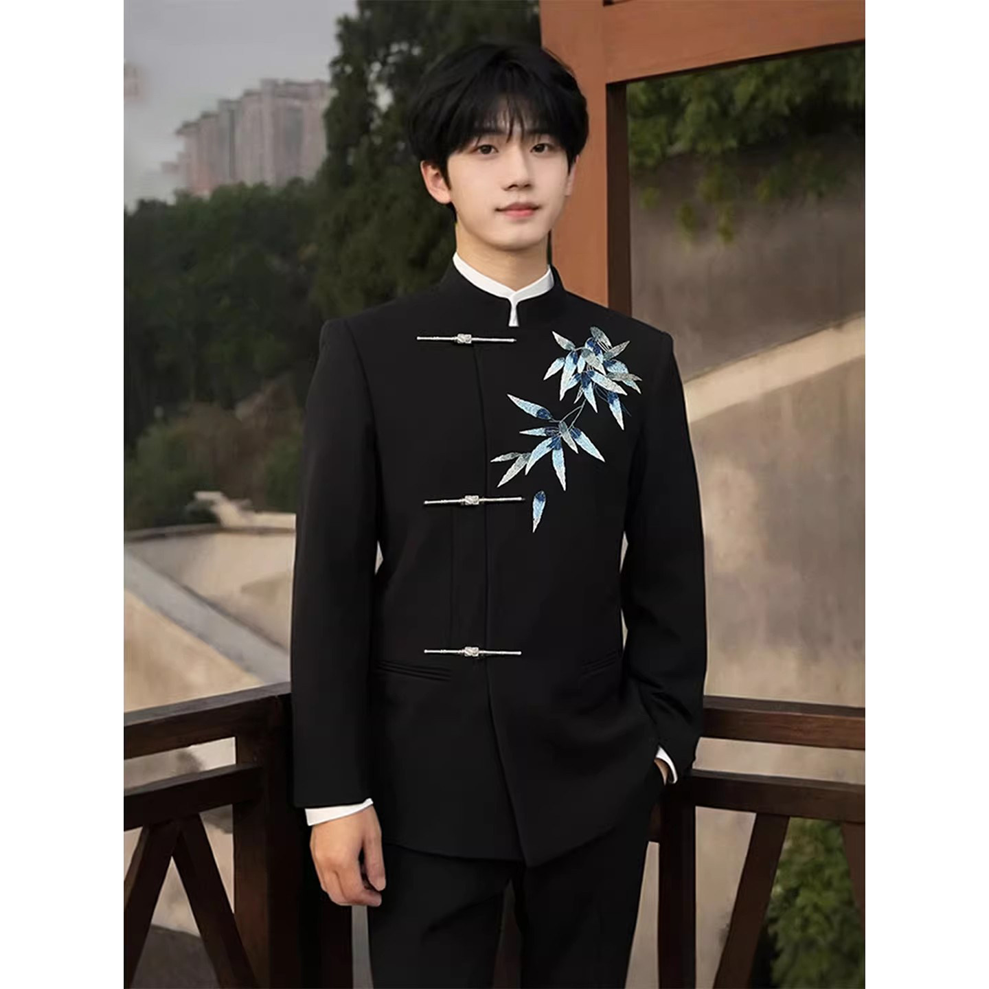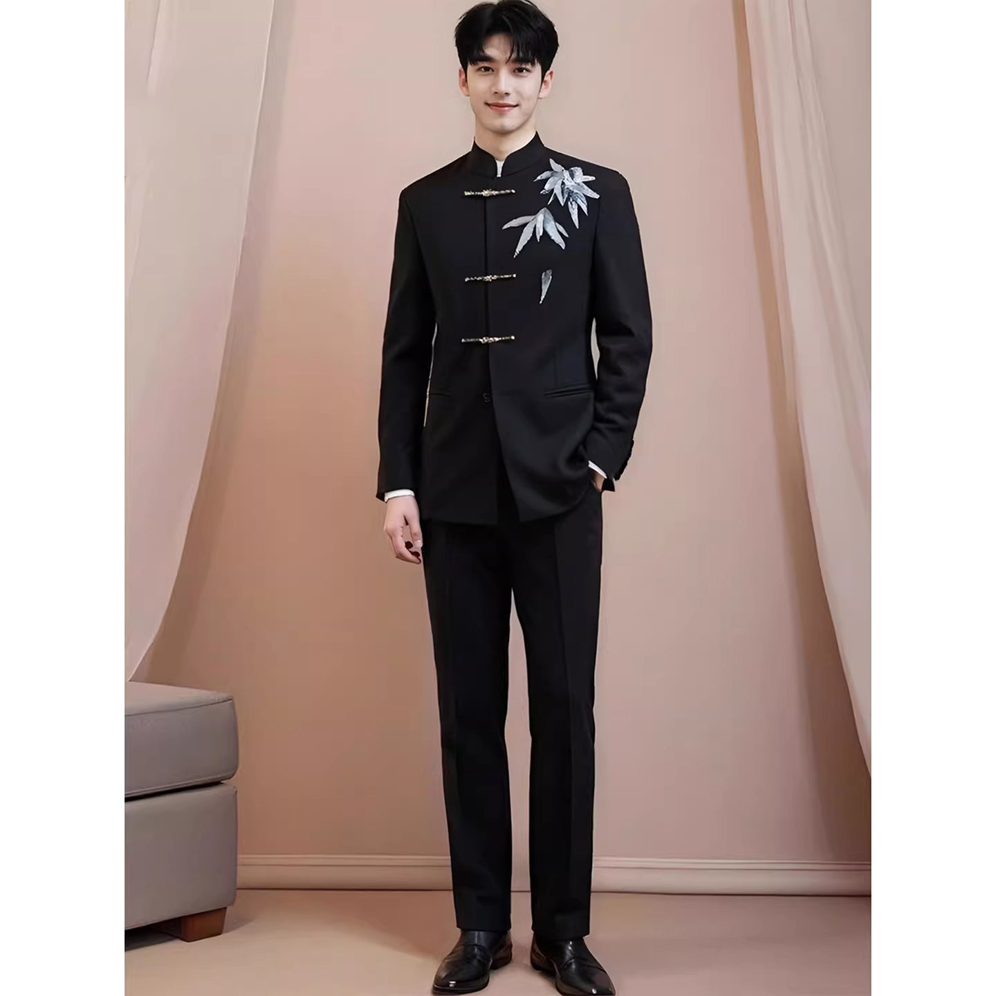 男士中山装新中式西装套装新郎订婚结婚唐装礼服竹叶刺绣垫肩西服