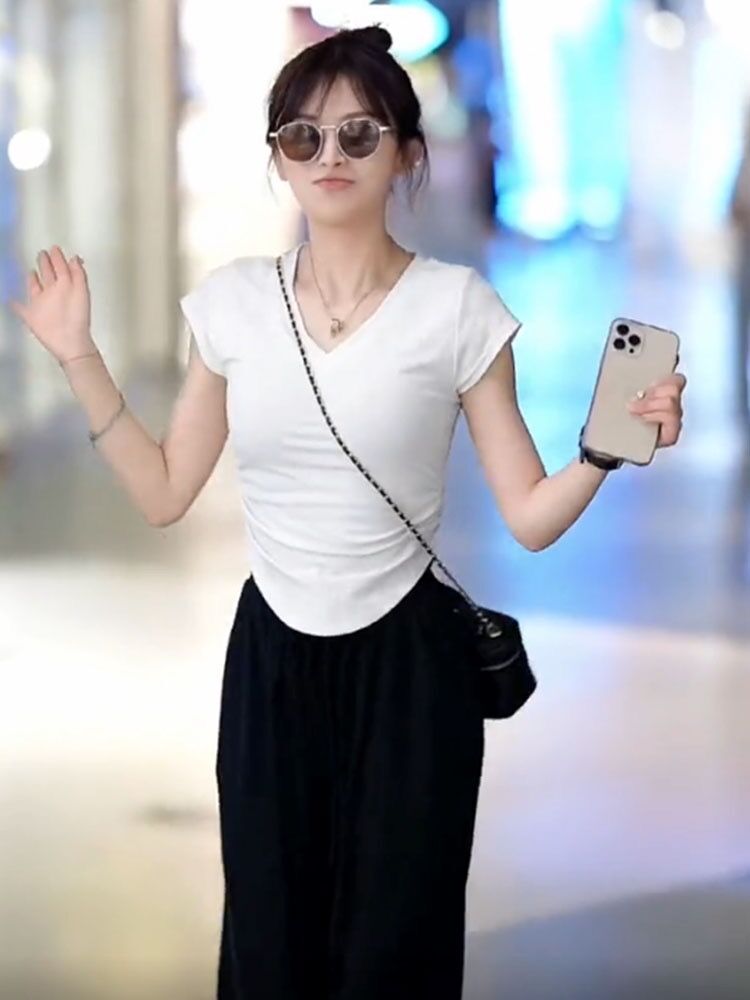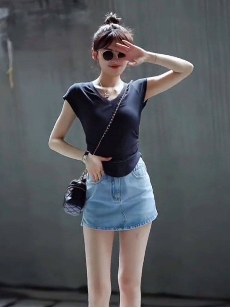 纯欲风辣妹莫代尔V领上衣夏季新款褶皱修身显瘦t恤短袖打底衫女潮