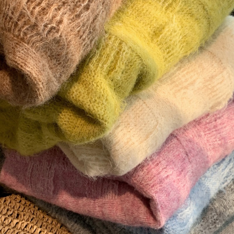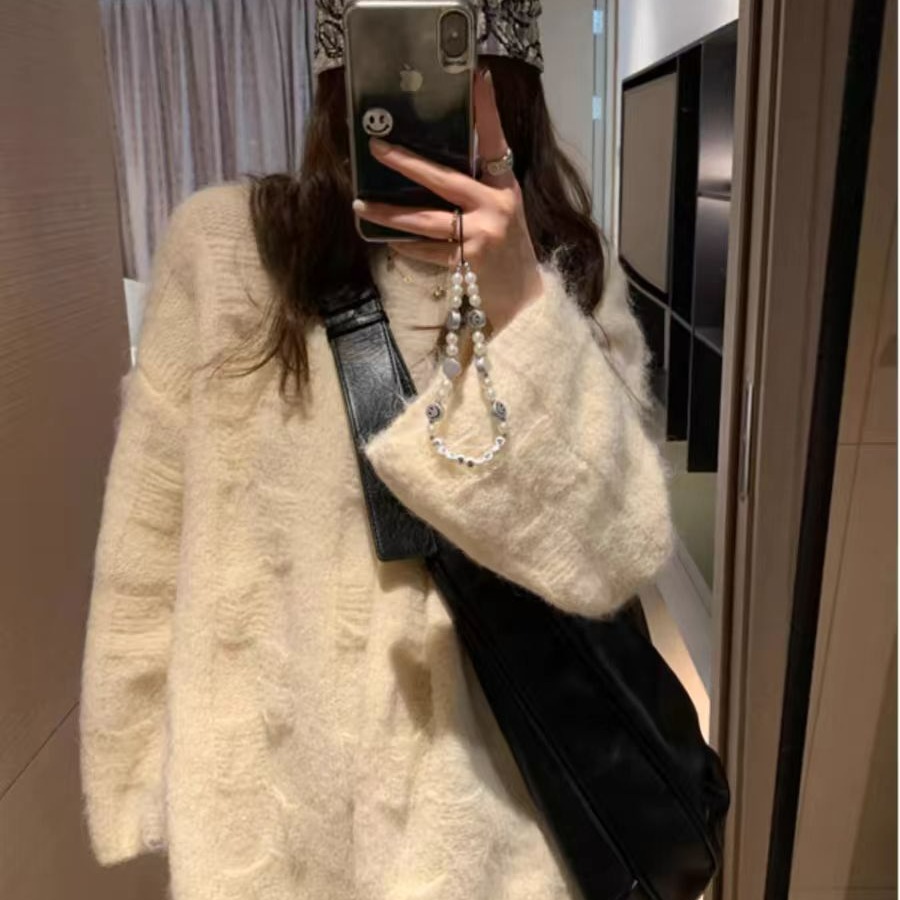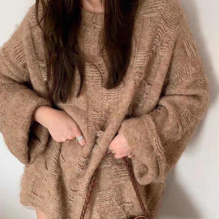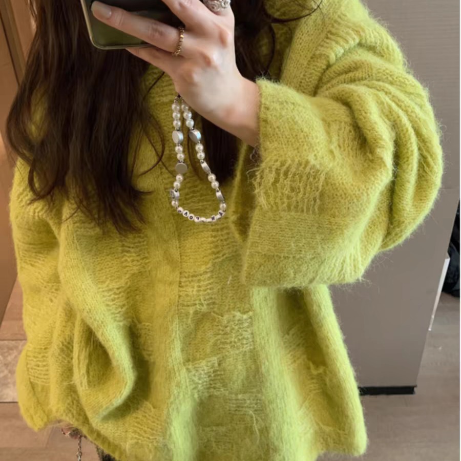十三行2025秋冬新品慵懒风暗纹格子肌理感马海毛宽松中长款毛衣女