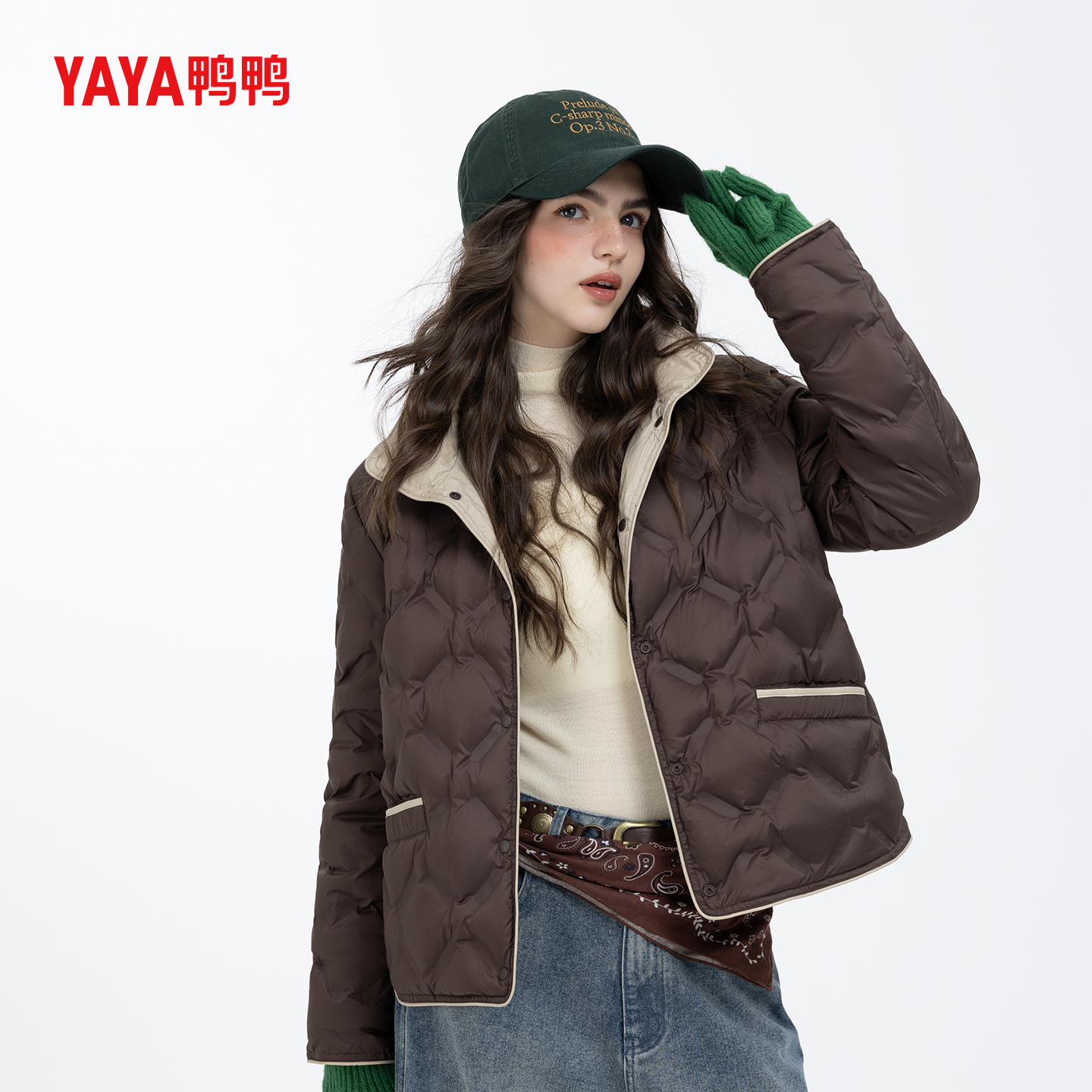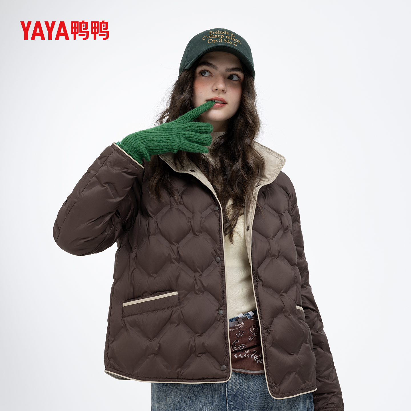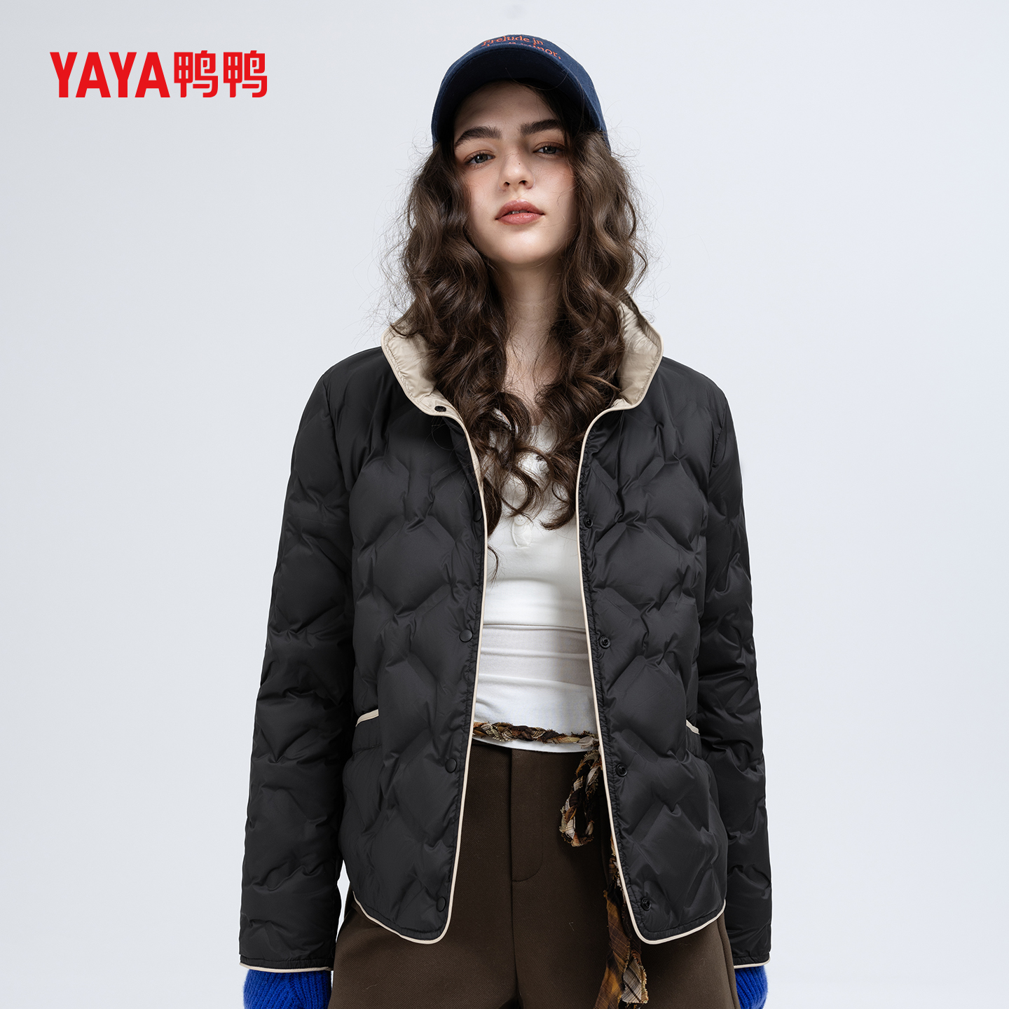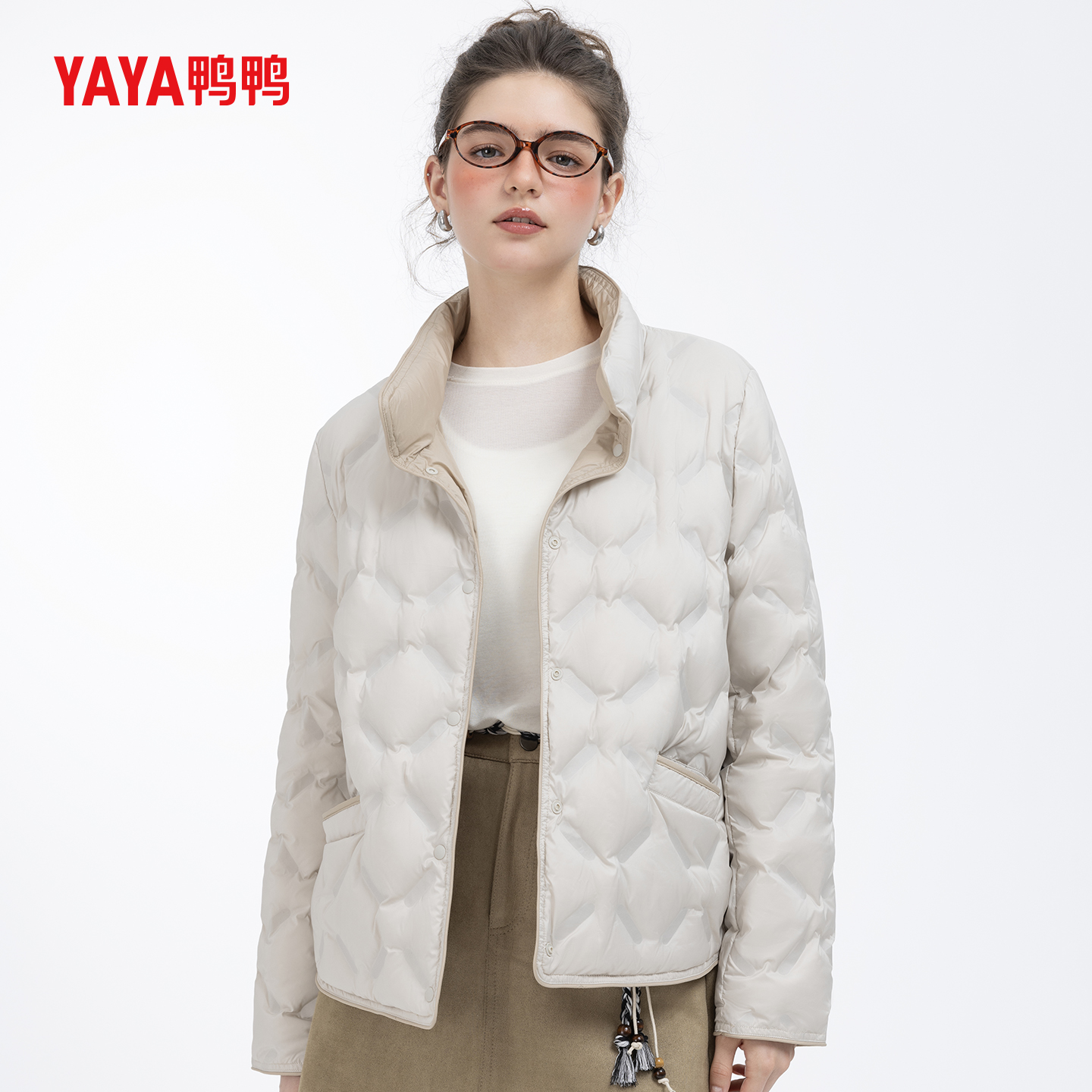 YAYA鸭鸭2025女士新款时尚外套秋冬季立领短款羽绒服保暖拼色外套