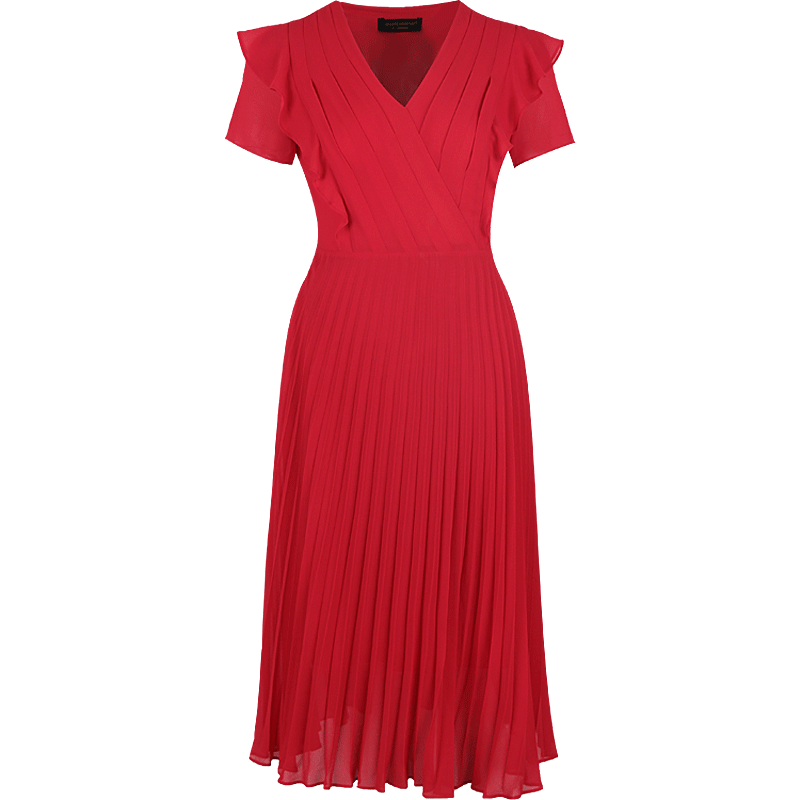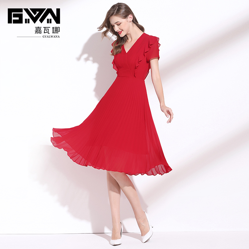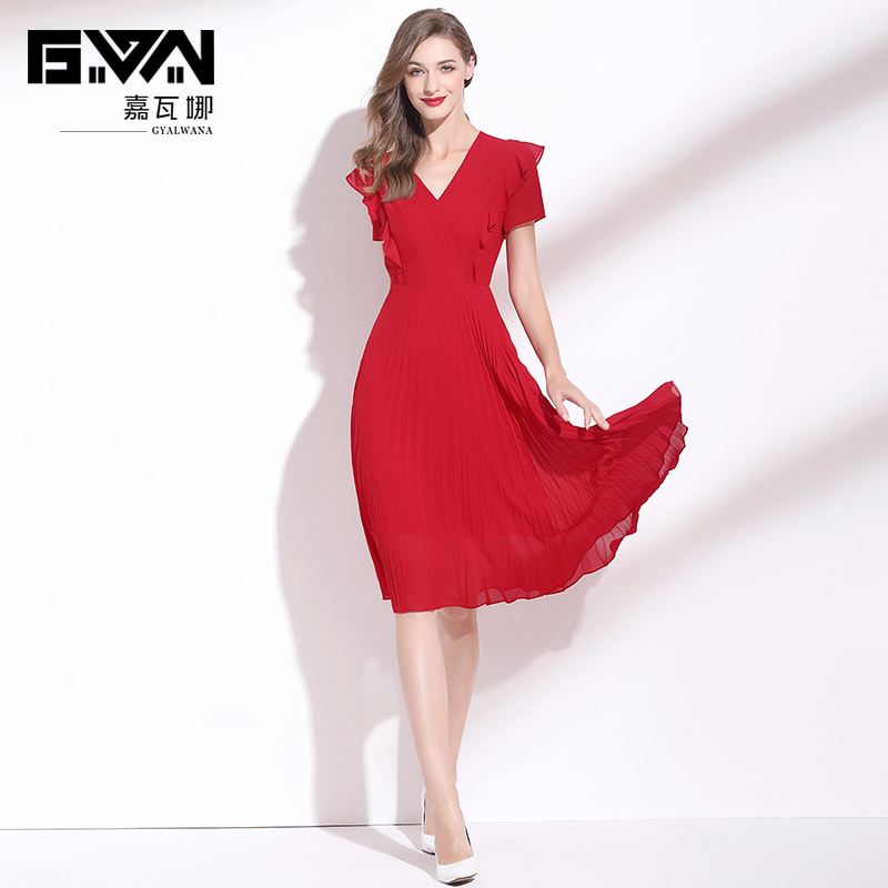 2025年夏季新款名媛气质高端红色雪纺连衣裙v领荷叶袖百褶裙女夏