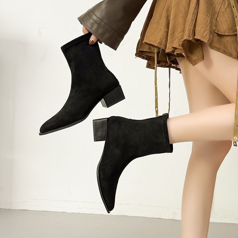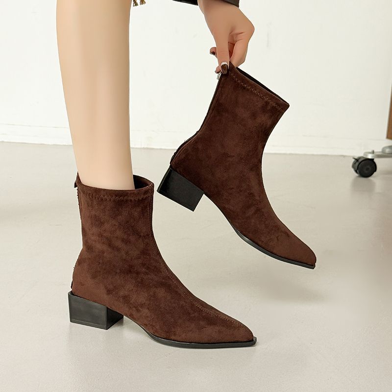 35-44大码短靴女43绒面尖头短靴子42棕色瘦瘦马丁靴法式小裸靴41
