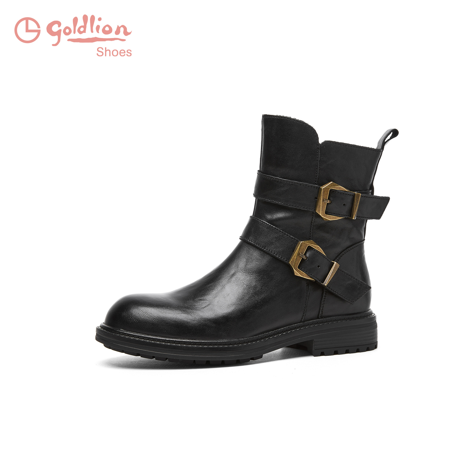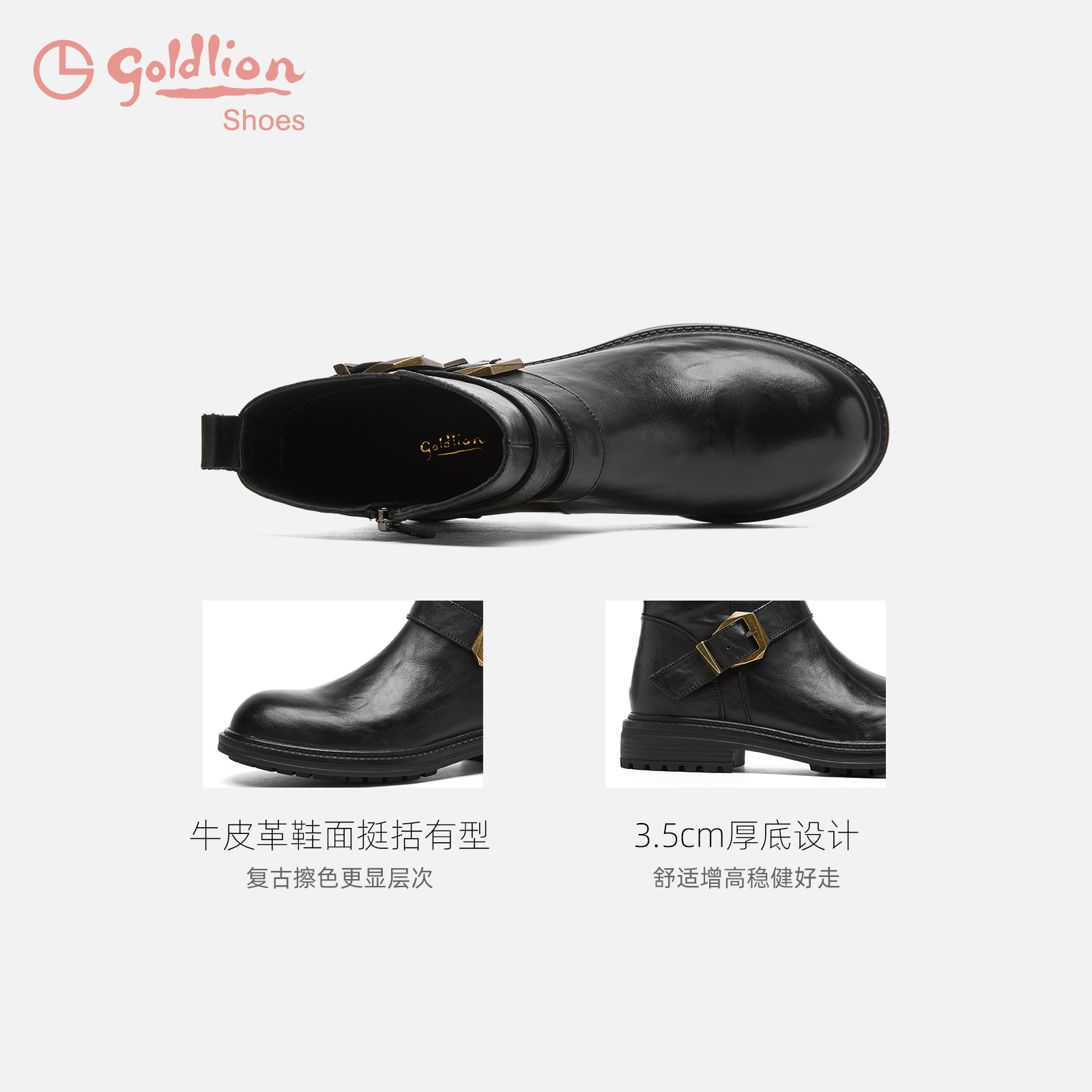 金利来女鞋2025秋冬新款英伦风皮带扣机车靴女黑色粗跟圆头短靴女