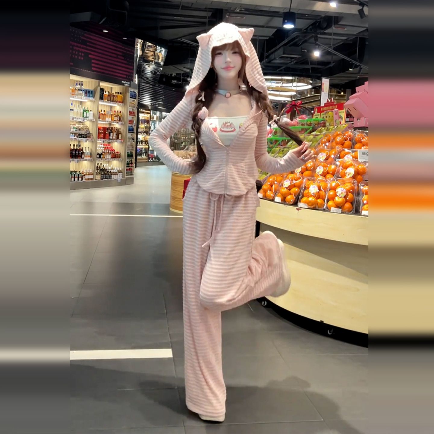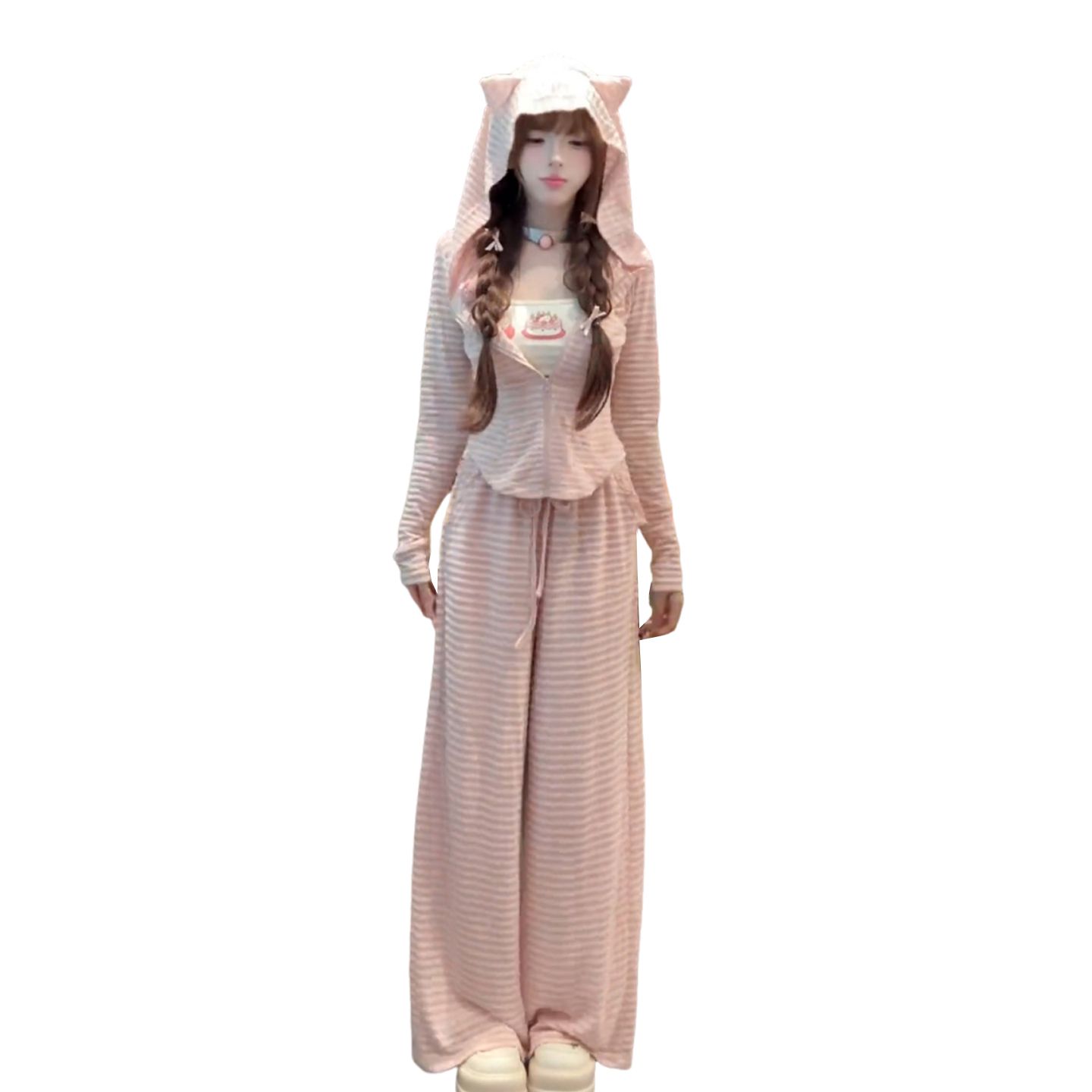 2025新款粉色条纹减龄休闲运动穿搭一整套女早秋季小个子三件套装