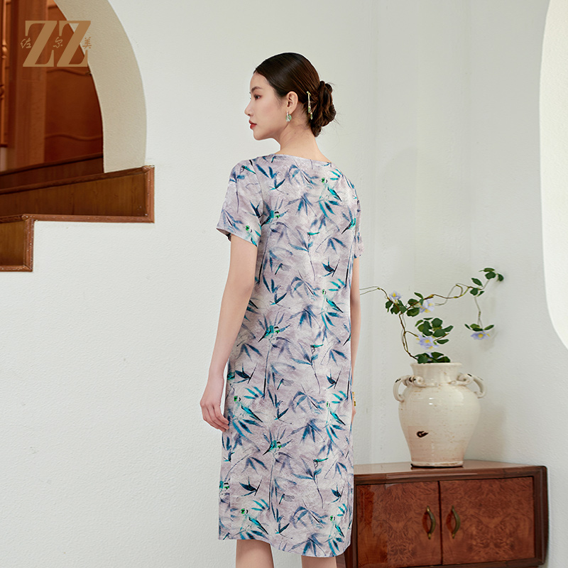 佐尔美夏季新款 气质优雅碎花植物桑蚕丝短袖连衣裙女M42LS36