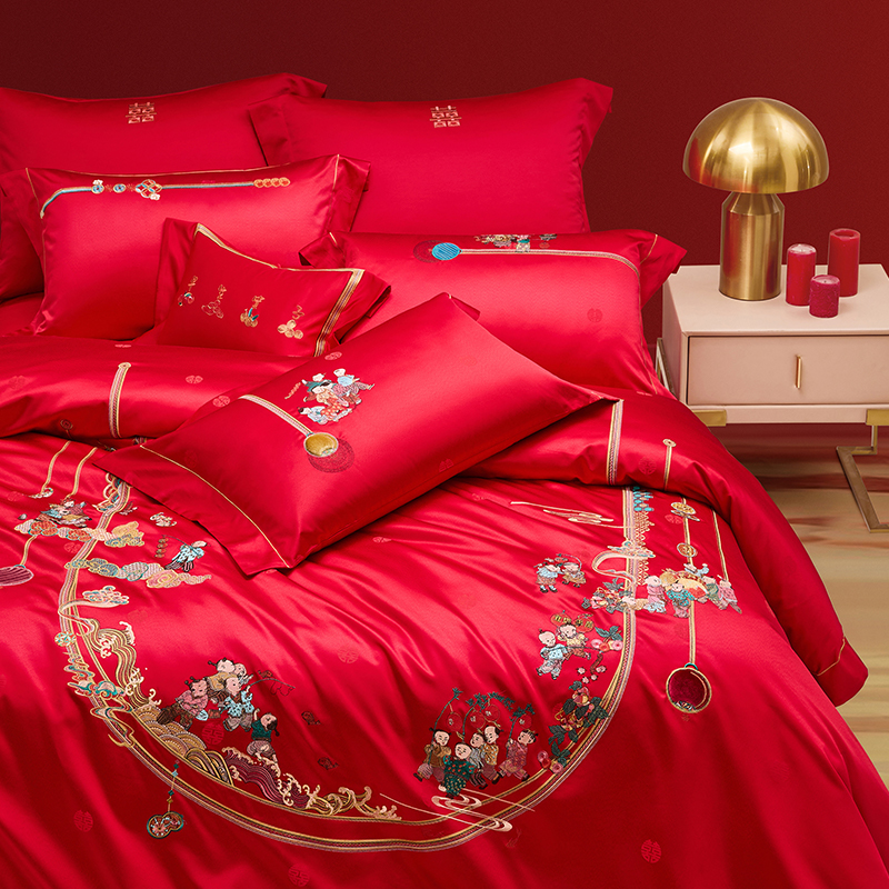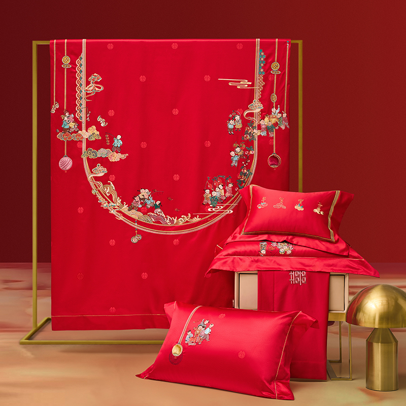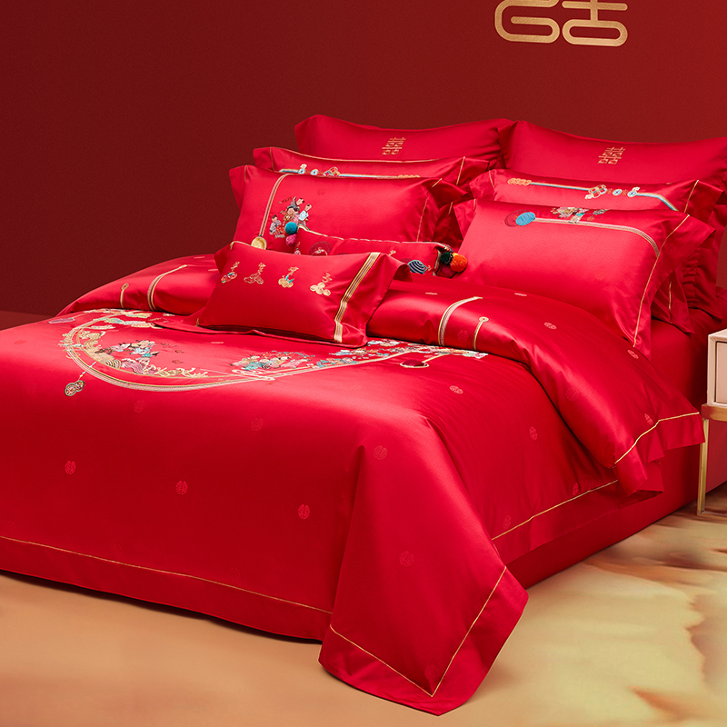 罗莱家纺结婚床上用品提花婚庆床单被套大红色喜被八件套