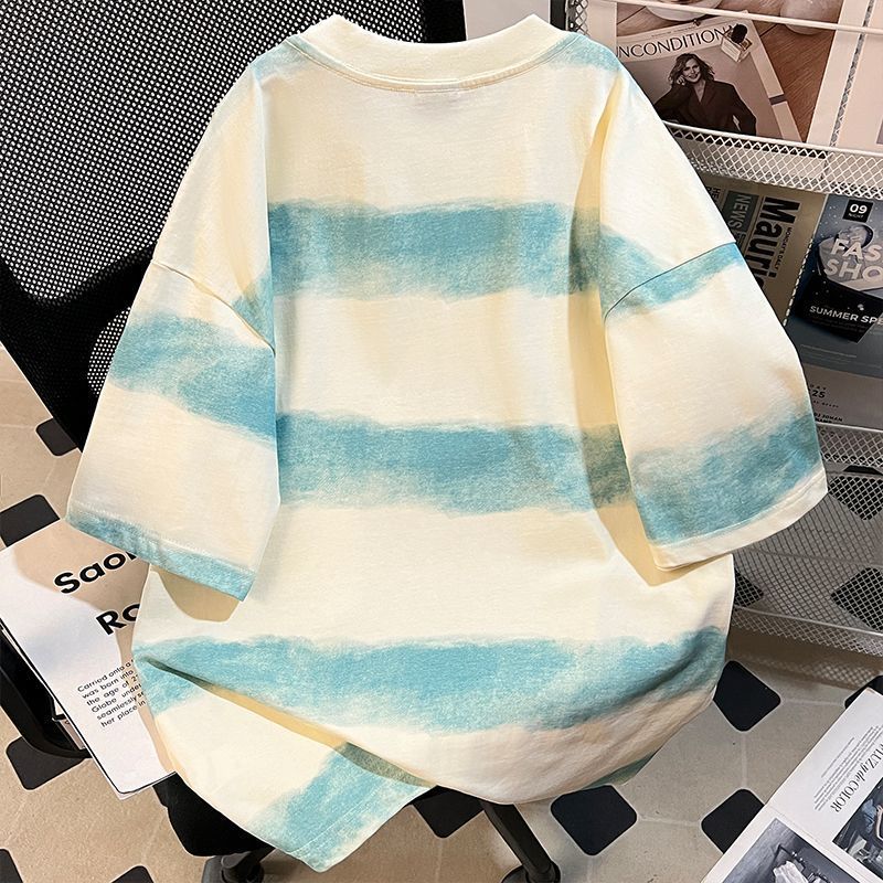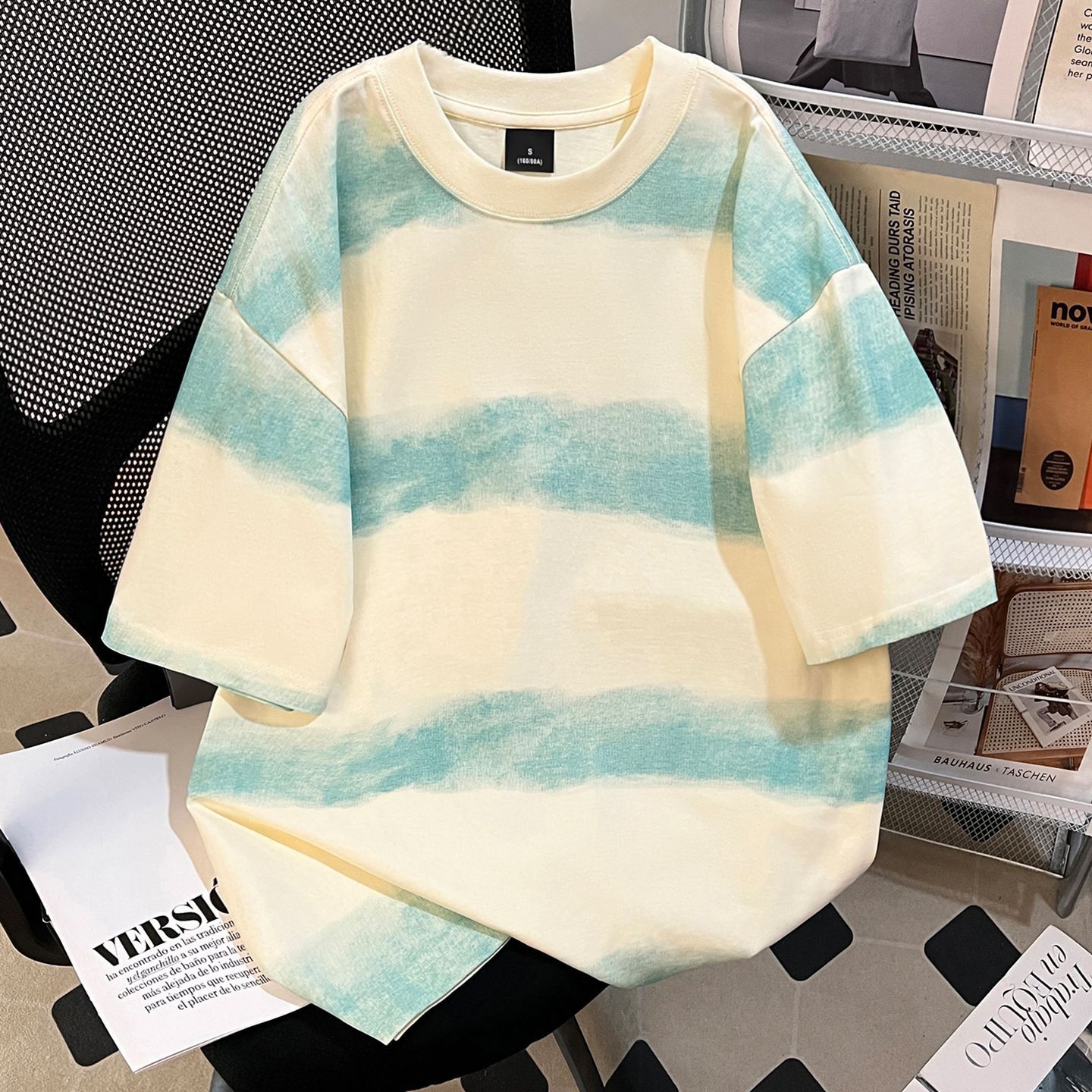 圆领短袖t恤男士2025新款夏季扎染拼色条纹大码宽松半袖上衣休闲