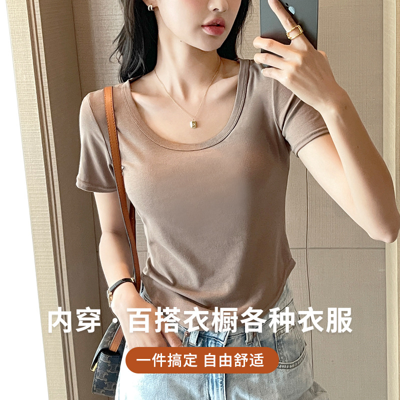 严选抖音直播短袖t恤女新款夏薄款内搭u领打底衫外穿白色短款上衣
