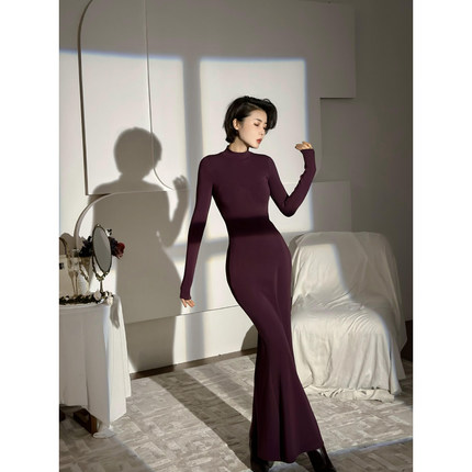 XULU原创秋冬美利诺羊绒针织紫色长款鱼尾裙优雅收腰半高领连衣裙