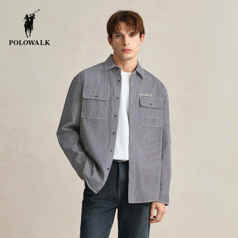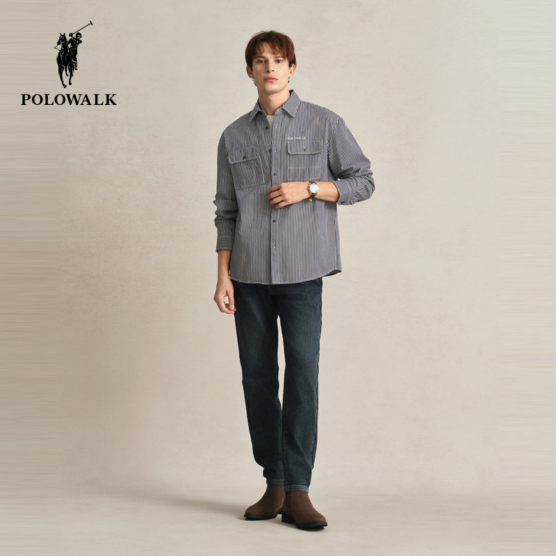 POLOWALK纯棉长袖衬衫男士秋冬新款商务休闲衬衣男上衣外套