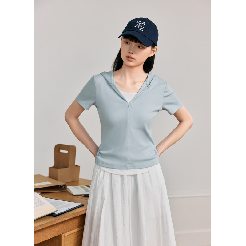 紫涵假两件连帽短袖T恤女2025夏季新款捏褶收腰显瘦蓝色拉链上衣